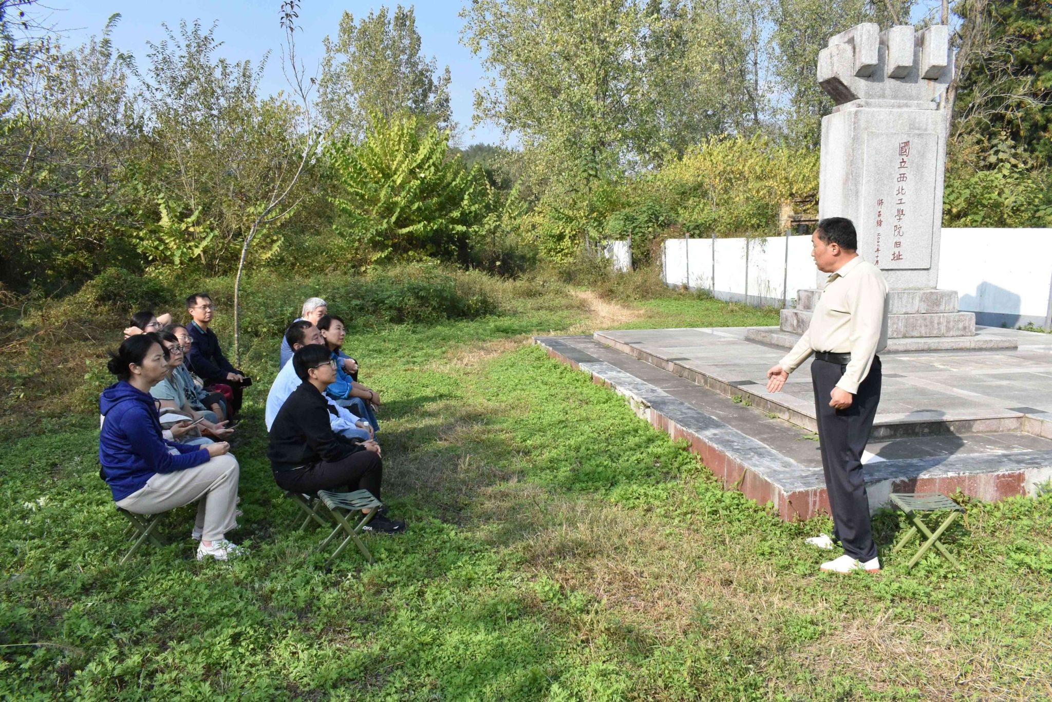 在国立西北工学院旧址纪念碑前,学员们认真聆听了城固县博物馆原馆长苟保平老师的现场授课,一起重温了西北联大艰苦的创始岁月和发展历程。苟馆长细致生动地讲述了抗日战争时期,诞生于民族危亡之际的国立西北联合大学经历了“自合至分”和“辗转迁徙”的发展轨迹,国立西北工学院的学子们不畏艰难、刻苦求学的感人事迹。正是凭借着这样的精神与情怀,古路坝先后走出了一千多位毕业生,其中有“中国航天材料之父”师昌绪、清华大学原校长高景德等十余位两院院士。古路坝为我国的抗战胜利和经济社会发展提供了有力的人才支持,“古路坝灯火”激励着西工大人追忆先辈们教育救国的理念与情怀。