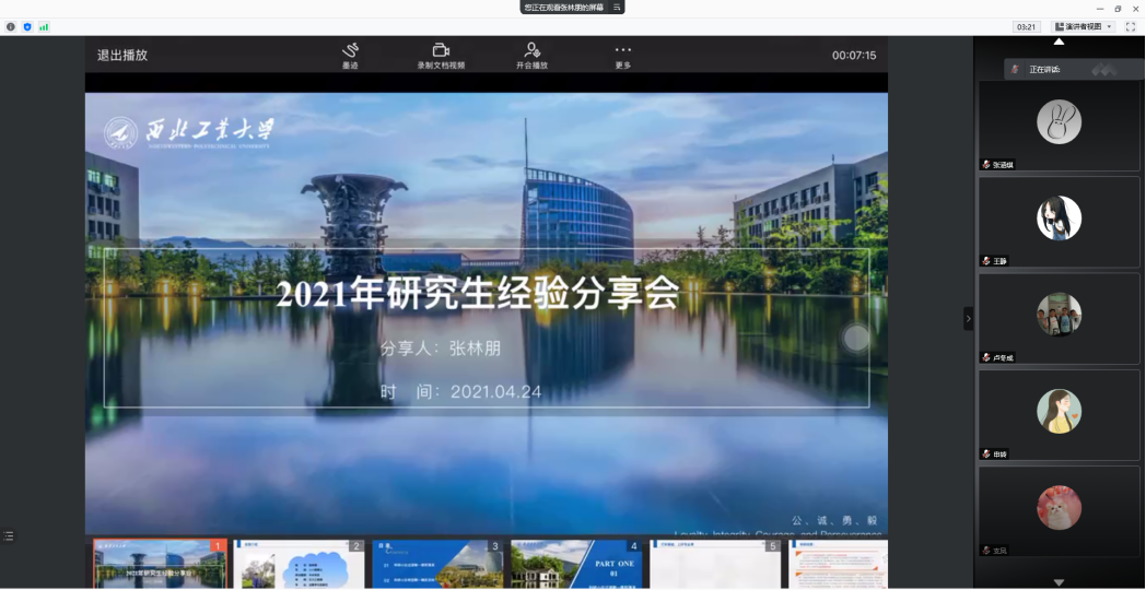 2021年4月23日,香香腐宅 举行了2021届研究生优秀毕业生线上分享会,2021届优秀毕业生闫璐瑶、张林朋和卢冬成三位毕业生围绕他们在校期间的生活、科研、工作等方面,为学弟学妹们分享经验。