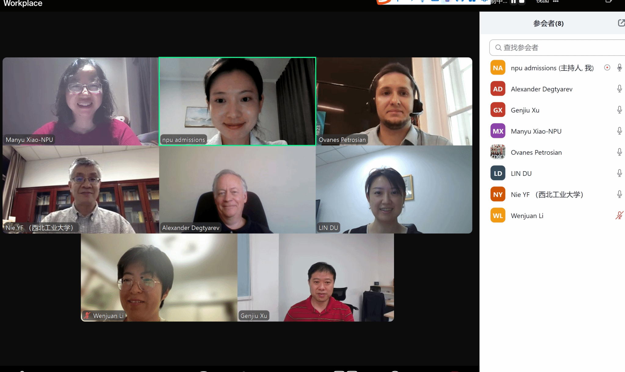 俄方出席人员包括圣彼得堡国立大学外事处主任Tatyana Ryazantseva女士、人工智能中心主任及应用数学与过程控制系数学博弈论和统计决策教研室副教授Ovanes Petrosyan、计算机建模与多处理器系统研究室教授Aleksandr Degtyarev与编程技术研究室副教授Ivan Blekanov。数统学院出席人员包括院长聂玉峰、国际化副院长都琳、研究生副院长徐根玖、国际交流与合作办公室主任肖曼玉、调和分析与几何分析团队教授李文娟、国际化秘书李卓榕。会议由李卓榕主持。