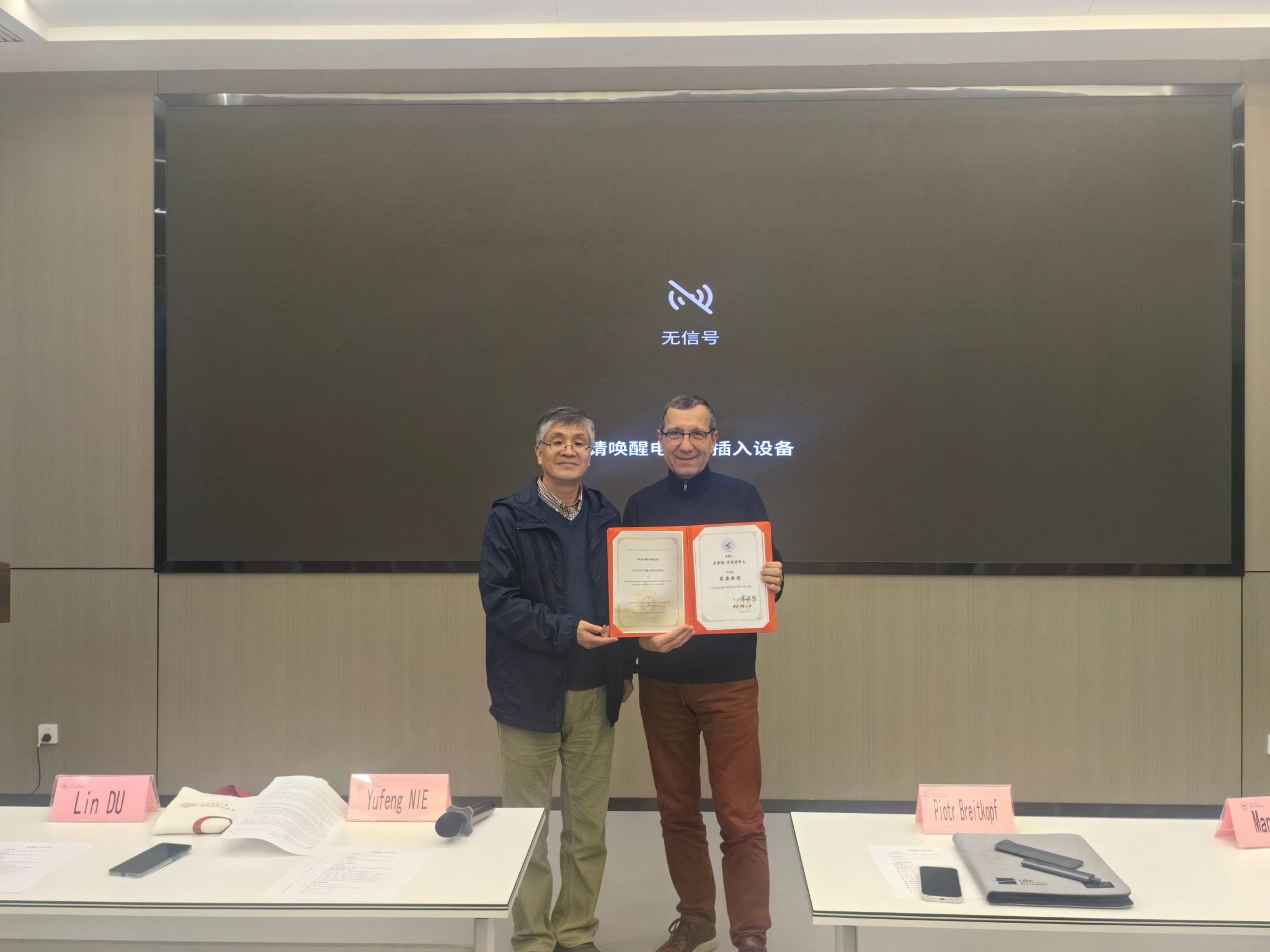 论坛伊始,聂玉峰院长代表学院致欢迎辞。他首先对Piotr教授的再次到访表示热烈欢迎,并回顾了去年率队访问法国贡比涅技术大学期间Piotr教授给予的热情接待。聂院长指出,Piotr教授此次做客“九章国际论坛”,不仅是两校深厚友谊的延续,更是推动双方科研合作深化与人才联合培养拓展的重要契机。他期待通过此次高水平交流,使学院师生能够近距离感受国际顶尖学者的学术风采与科研精神。致辞结束后,聂玉峰院长为Piotr教授颁发学校“客座教授”聘任证书,全体参会师生合影留念。