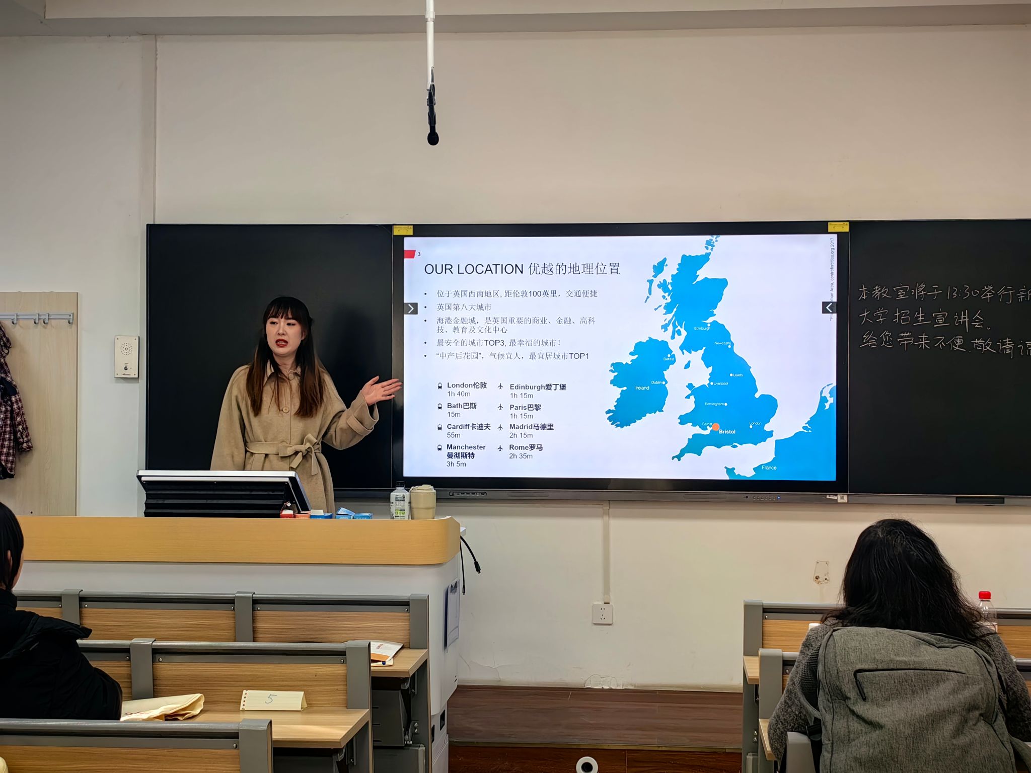 英国布里斯托大学王秋红老师聚焦 3+1 本硕连读项目进行专项推介。她介绍,布里斯托大学 2026 年 QS 世界排名第 51 位,其工科与数学学科实力雄厚,3+1 项目采用 “3 年国内本科 + 1 年海外硕士” 的培养模式,可实现学分互认与双学位授予。她从奖学金设置、专业课程体系、升学衔接流程、就业竞争力等方面展开说明,强调该项目为学生提供了 “低成本、高含金量” 的国际化深造路径,鼓励成绩优异、语言达标的本科生积极申报。