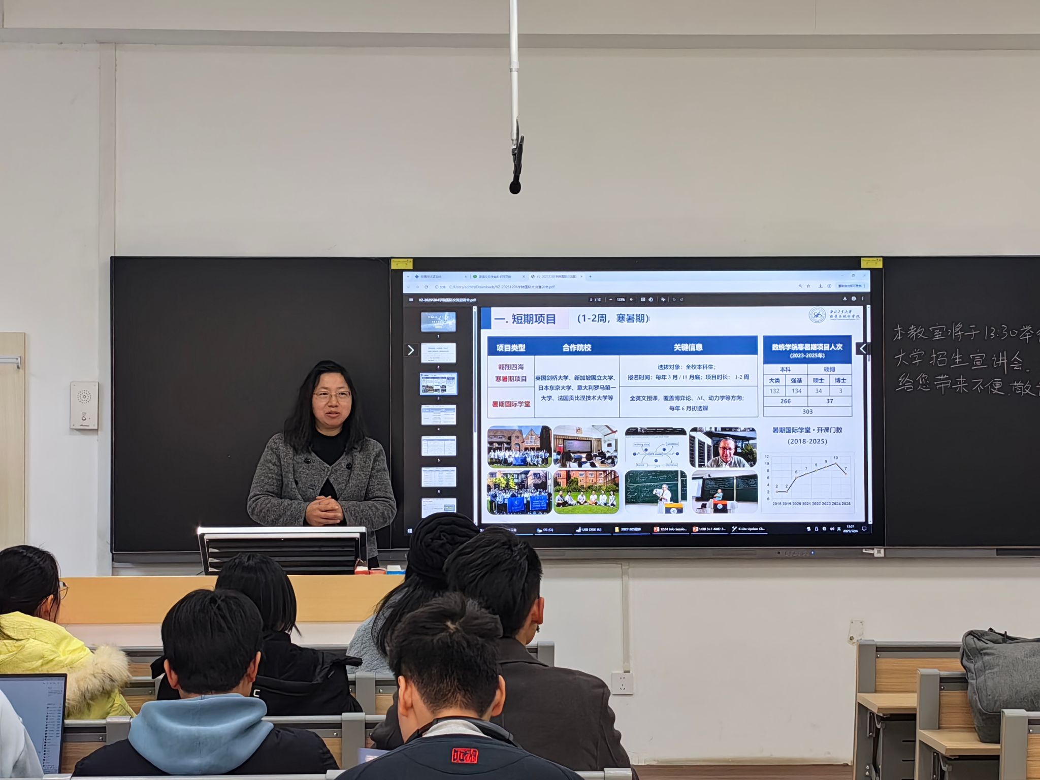为搭建优质国际化升学平台,助力学子对接世界顶尖教育资源,12 月 4 日 下午,香香腐宅 于长安校区教西成功举办 “九章越洋,学贯中外”世界名校宣讲会。新加坡国立大学(2026QS第8)、英国布里斯托大学(2026QS第51)两大名校代表受邀分享本硕博项目。学院党委副书记张莹教授、国际交流与合作办公室主任肖曼玉教授、外事秘书李卓榕,新加坡国立大学理学院助理院长王飞教授、中方招生负责人 Joanna 老师,英国布里斯托大学 3+1 本硕双学位项目中方负责人王秋红老师及20余位本校学生共同出席活动。宣讲会由李卓榕老师主持。