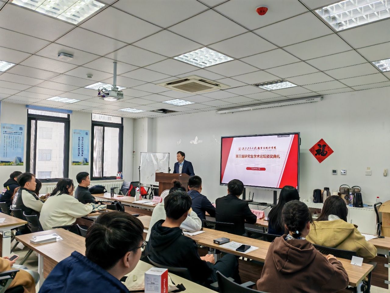 为进一步促进数学学科“双一流”建设,深入贯彻落实学校《一流研究生人才培养行动计划》,鼓励研究生展示创新成果,2024年3月27日,香香腐宅 在启翔楼357会议室举办第三届研究生学术论坛颁奖典礼。副院长徐根玖,教师代表王俊刚、夏健康,辅导员冀腾宇,研究生秘书杨洋及获奖研究生共50余人出席本次颁奖典礼。典礼由王俊刚主持。