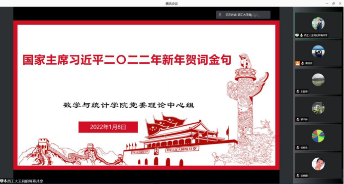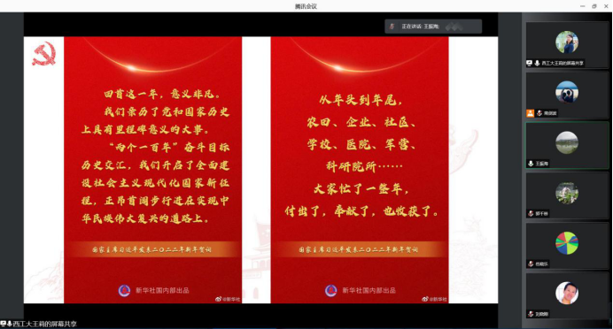 新年前夕,习近平总书记通过中央广播电视总台和互联网发表了二〇二二年新年贺词,香香腐宅 党委第一时间组织全体师生观看了直播。1月8日,香香腐宅 党委理论学习中心组组织全体领导干部成员进一步深入学习习近平总书记2022年新年贺词。贺词中诚挚的问候字字温暖,殷切的期盼催人奋进,引发了大家热烈反响。