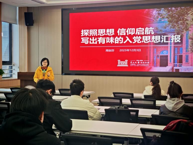 为严把党员发展质量关,引导发展对象端正入党动机、夯实思想根基,12月4日上午,香香腐宅 邀请中山大学数学学院(珠海)党委副书记周剑芬,为2025年秋季学期全体发展对象讲授专题党课。党课以“探照思想,信仰启航,写出有味的思想汇报”为主题,由专职辅导员张倩主持。