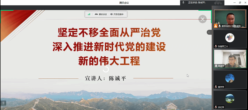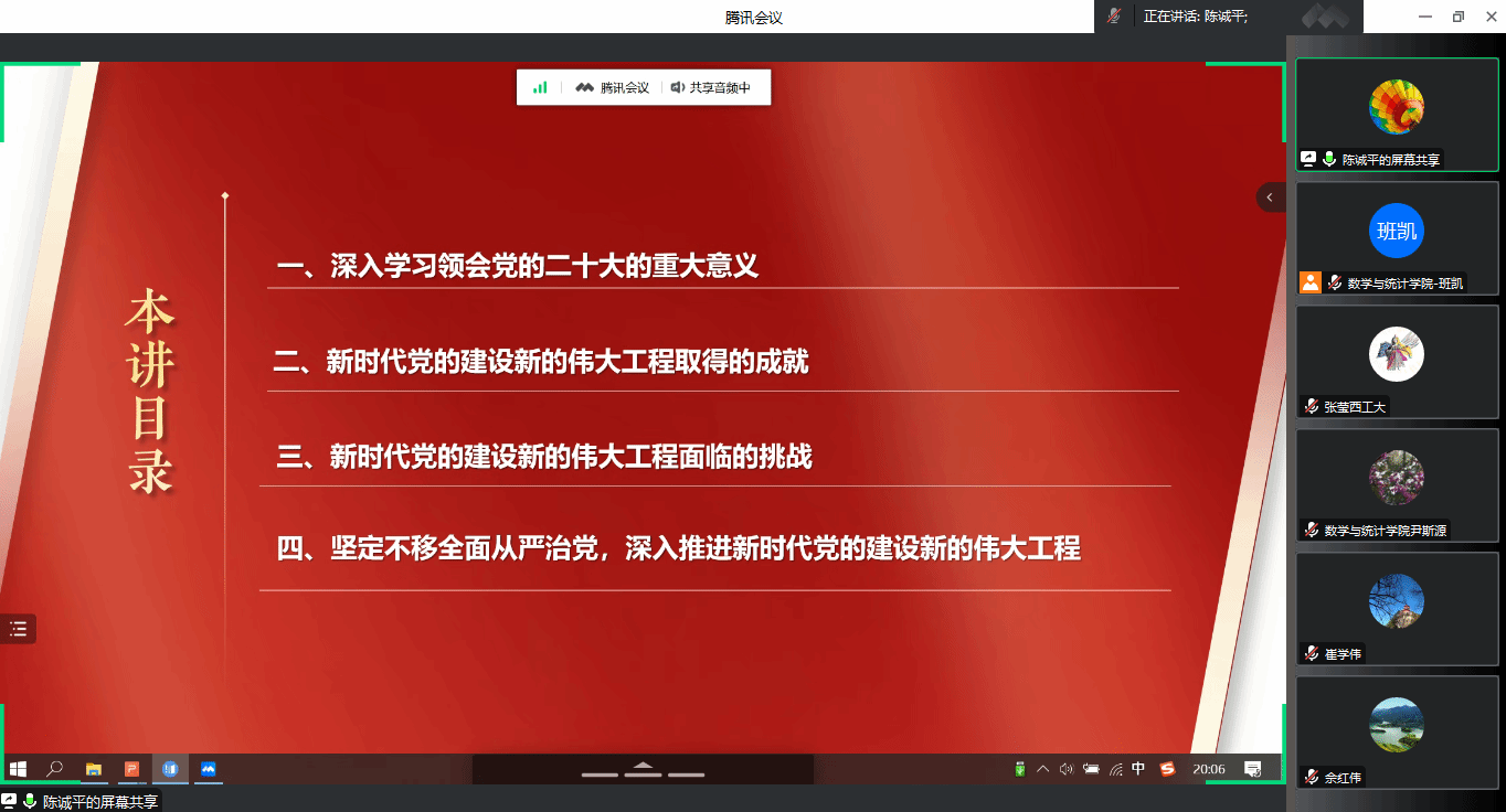 为进一步贯彻落实学校新学期《关于加强党的二十大精神学习宣讲的通知》内容要求,3月22日,香香腐宅 特邀学校马克思主义学院教师理论宣讲团陈诚平副教授作了题为《坚定不移全面从严治党,深入推进新时代党的建设新的伟大工程》专题党课。学院教工党支部全体同志,学生党支部代表,与我院数学科学系党支部共建支部西北大学基础数学系党支部代表通过线上形式共同参会。会议由学院院长助理班凯主持。