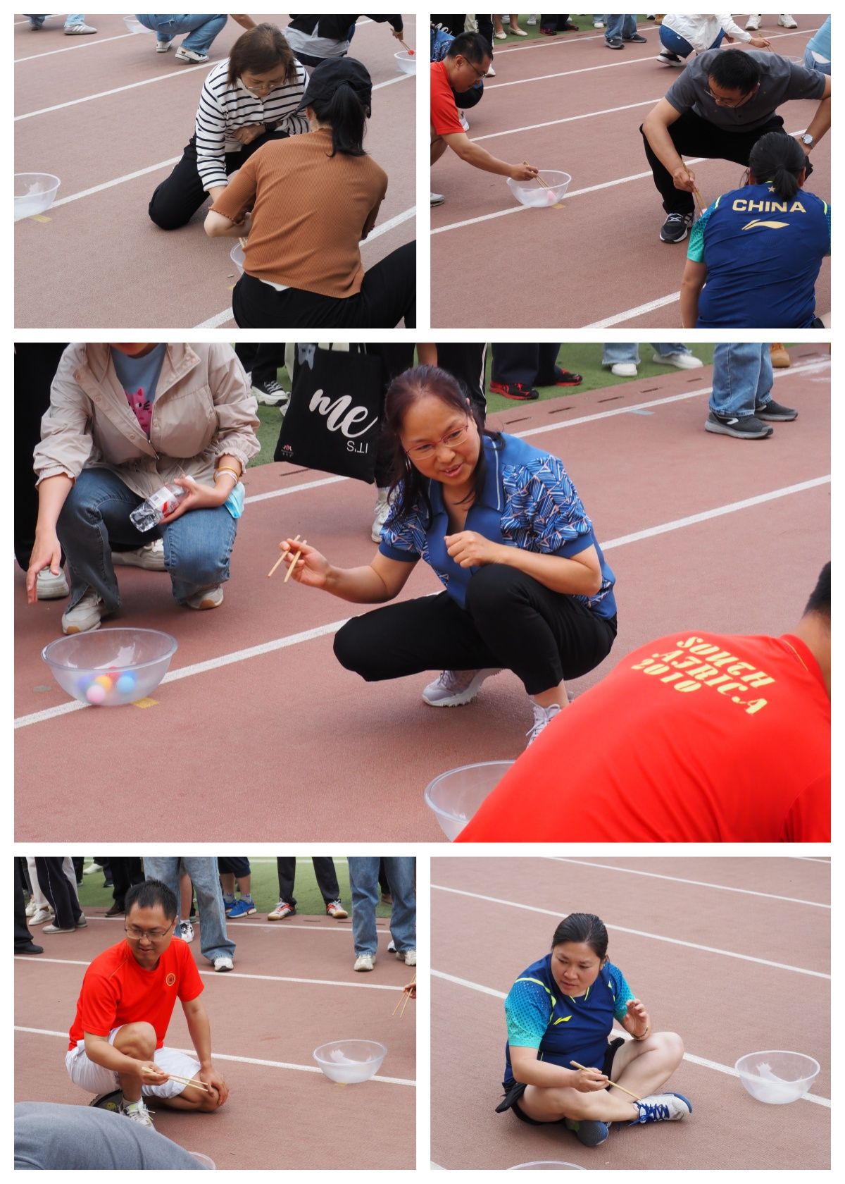 接下来进行的接力夹乒乓球项目同样充满挑战,需要参赛人员具备良好的手部控制能力和专注力。比赛过程中,学院老师们手持筷子,全神贯注,小心翼翼地夹起乒乓球,迅速而稳健地向后传递,力求在最短时间内完成接力。在八名老师的通力合作下,最终获得小组第一、总用时第二名。老师们在比赛中展现出的专注和细致,也赢得了现场观众的阵阵掌声。