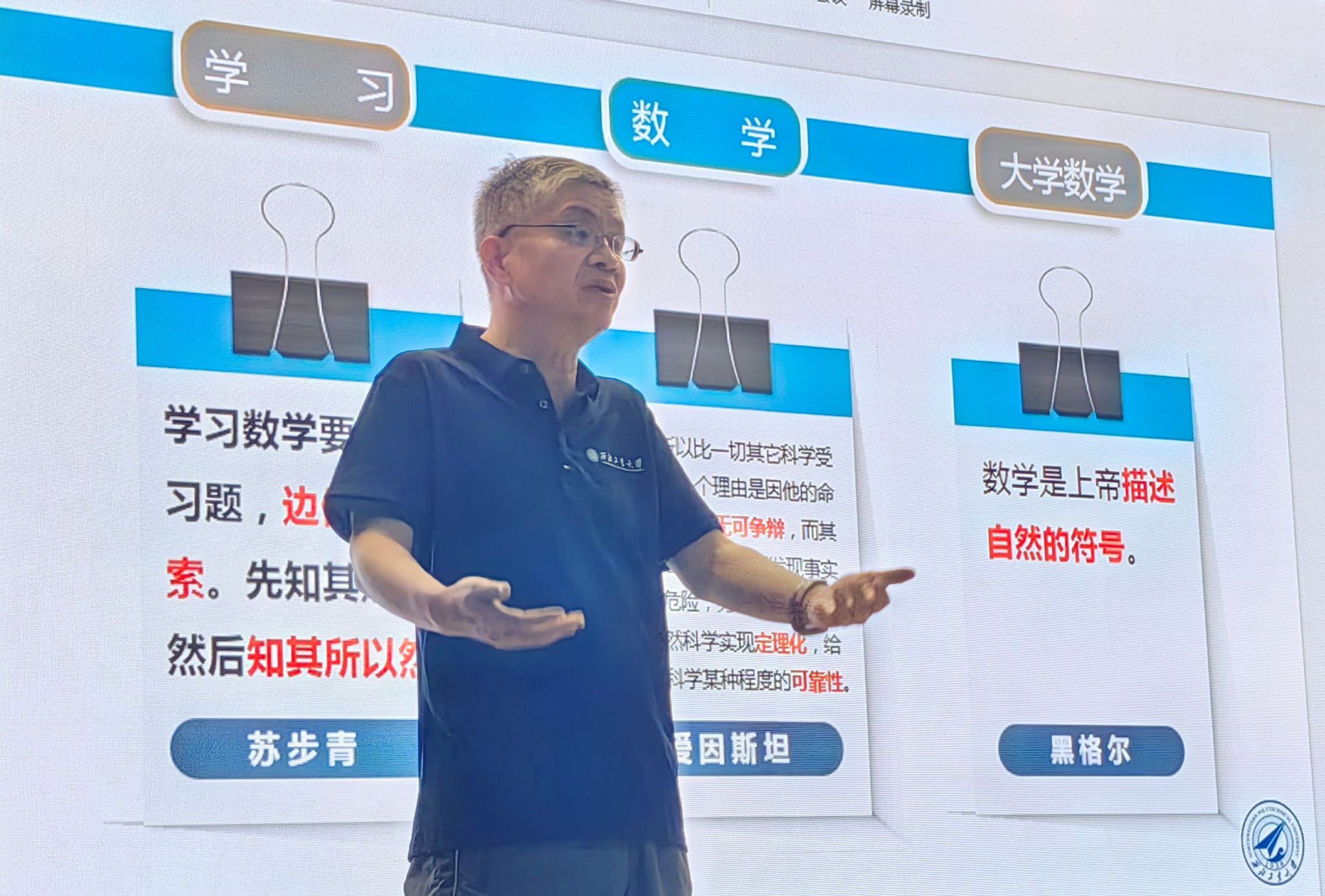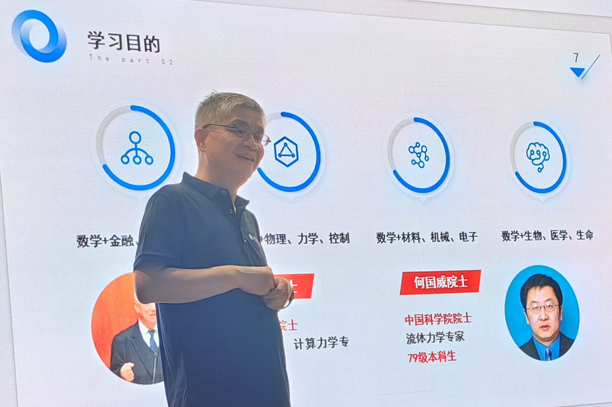 报告会上,聂院长主要从学习目的、学习内容、学习方法等方面展开陈述,内容丰富,事例生动。他不仅对同学们在学习阶段会接触的分析、代数、几何、随机、计算等五个方面内容进行了深入介绍,而且鼓励大家要勇于在软件工程、大数据处理、人工智能、量子力学、空气动力学等跨学科课程方面大胆尝试和探索,进而不断打好个人大学的学习基础,搭建好个人的知识架构。在谈到学习方法时,他引用了爱因斯坦、苏步青、华罗庚等知名学者的名言警句,引导大家在大学学习时,要学会边做边思索,具备一定的批判精神,善于用好学校、学院的各类优势平台,找到最终属于自己的学习方法,实现个人的学习目标。他也勉励同学们在大学四年生活中,争做有理想、敢担当、能吃苦、肯奋斗的新时代好青年,为学院发展和学校“127”目标的实现,不断贡献数学智慧和力量。