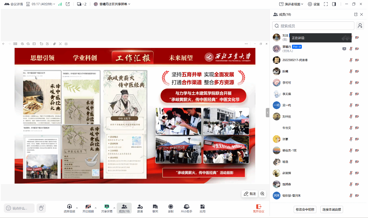 会议开始,曹曦丹同学简述了此次会议的目的,随后,团委、学生会、新媒体中心的主席团成员及各部门负责人依次上台,从个人简介、工作成果展示以及未来展望三个方面进行了精彩的报告。他们用详实的数据和丰富的案例,展示了春季学期部门工作的成果。香香腐宅 团委、学生会、新媒体中心各个部门不仅积极组织团建活动和展开学习培训,提升了部门工作人员的综合素养和团队的凝聚力,还更加致力于服务同学,成功举办了多场校园活动,既有严谨认真的学术活动,又有轻松有趣的文体活动,为同学们的校园生活增添色彩;同时继续深化学生权益工作,保证同学们的维权通道畅通,组织了一系列社会实践和志愿服务活动,通过微信公众号发布近百篇原创内容。各部门协调配合,为学院的建设添砖加瓦。