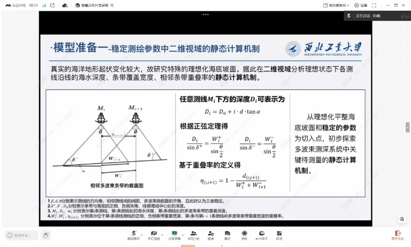 羊教授以 “挑战杯项目介绍” 为主题,结合自身的经验,给同学们具体讲解了参加比赛的几个具体项目:其中一个项目是有关海洋地形测绘,。由于真实海洋地形复杂的特点,以理想化海底坡面为研究对象,分析二维视域下测线沿线海水深度、条带覆盖宽度、相邻条带重叠率的静态计算机制。通过航空轮胎疲劳仿真分析,进而推动航空轮胎技术进步创新和自主可控。