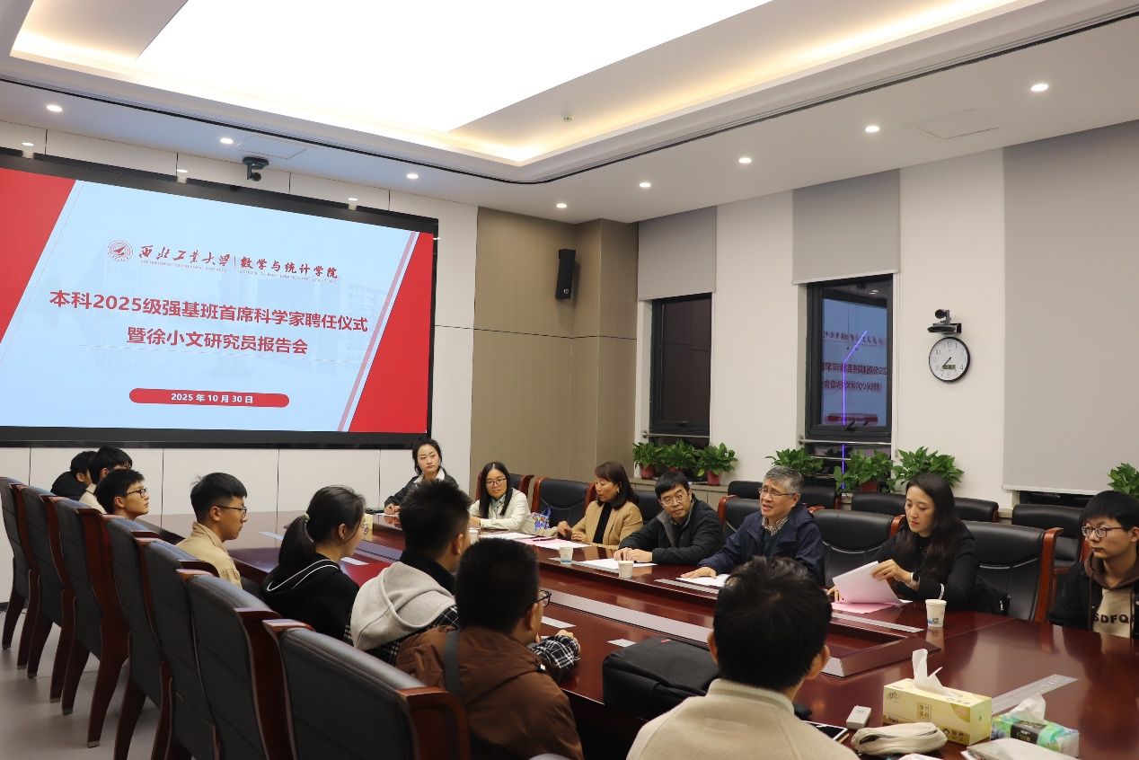 聂玉峰院长与王莉书记共同为徐小文研究员颁发首席科学家聘书。徐小文研究员围绕强基班培养目标,系统介绍了研究方向,并以邓稼先、于敏等“两弹一星”元勋为例,阐明了数学服务国家战略的基础地位。他特别指出,2025级学生的成长轨迹与我国2035年建成科技强国的目标高度契合,勉励同学们把握时代机遇,夯实专业基础,未来为科技强国建设贡献西工大数学人的智慧与力量。