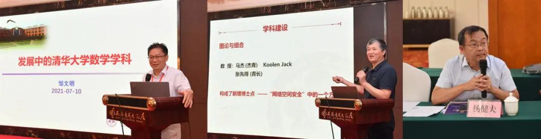 7月10日下午论坛聚焦基础数学学科建设。郭千桥首先汇报了我校基础数学学科建设现状。邹文明以“发展中的清华大学数学学科”为题介绍了清华大学数学学科建设经验,李嘉禹、杨健夫也分别介绍了中国科学技术大学和江西师范大学数学学科建设的有益经验。在座谈环节,孙笑涛、冯荣权对我校基础数学学科建设进行了具体指导。