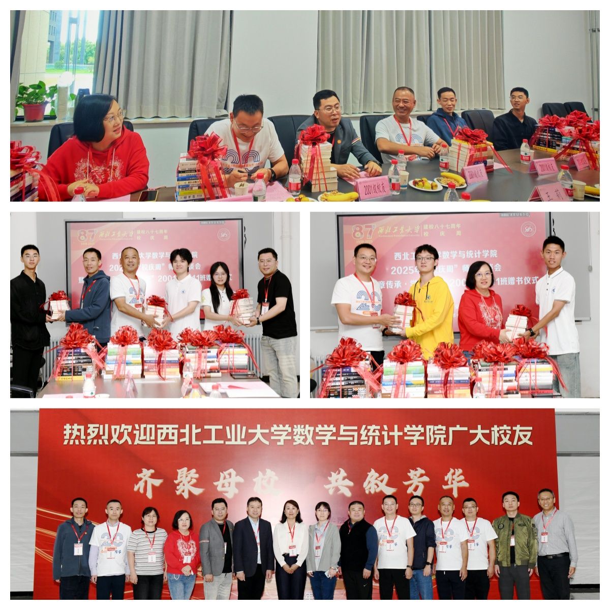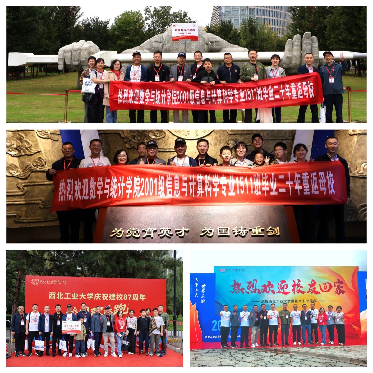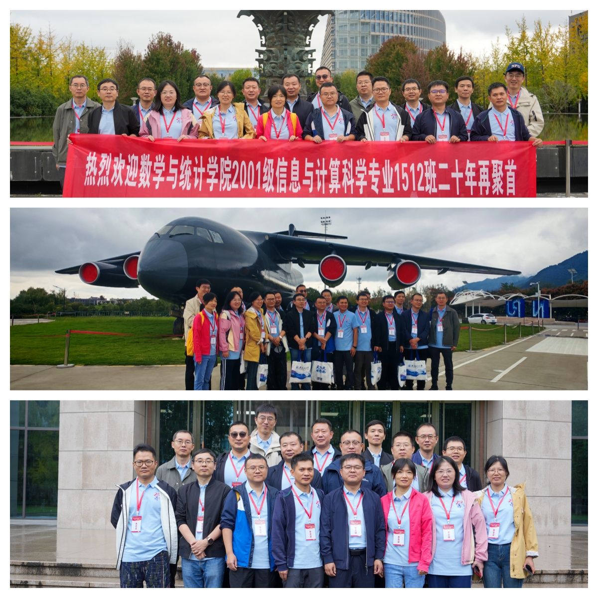 当天早上,在校友会的精心部署安排下,三个返校班级连同家属共计80余人,在学院三组学生志愿者的引导下,上下午分别“重走校园路”。在友谊、长安两校区“公”“诚”“勇”“毅”四大标志性建筑,老校区图书馆,知名“网红”地三航博物馆,“为国铸剑”的何尊广场,新校区“亚洲最大”水上图书馆,饱含底蕴的校史馆等地处处留下校友们意气风发的身影,自豪、温馨、共情……2001级信息与计算科学专业1511班、1512班先后组织的主题班会更是将工大数学人的骄傲洒满整个校园。