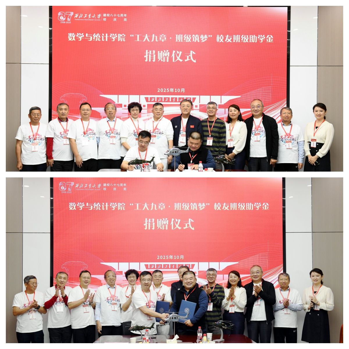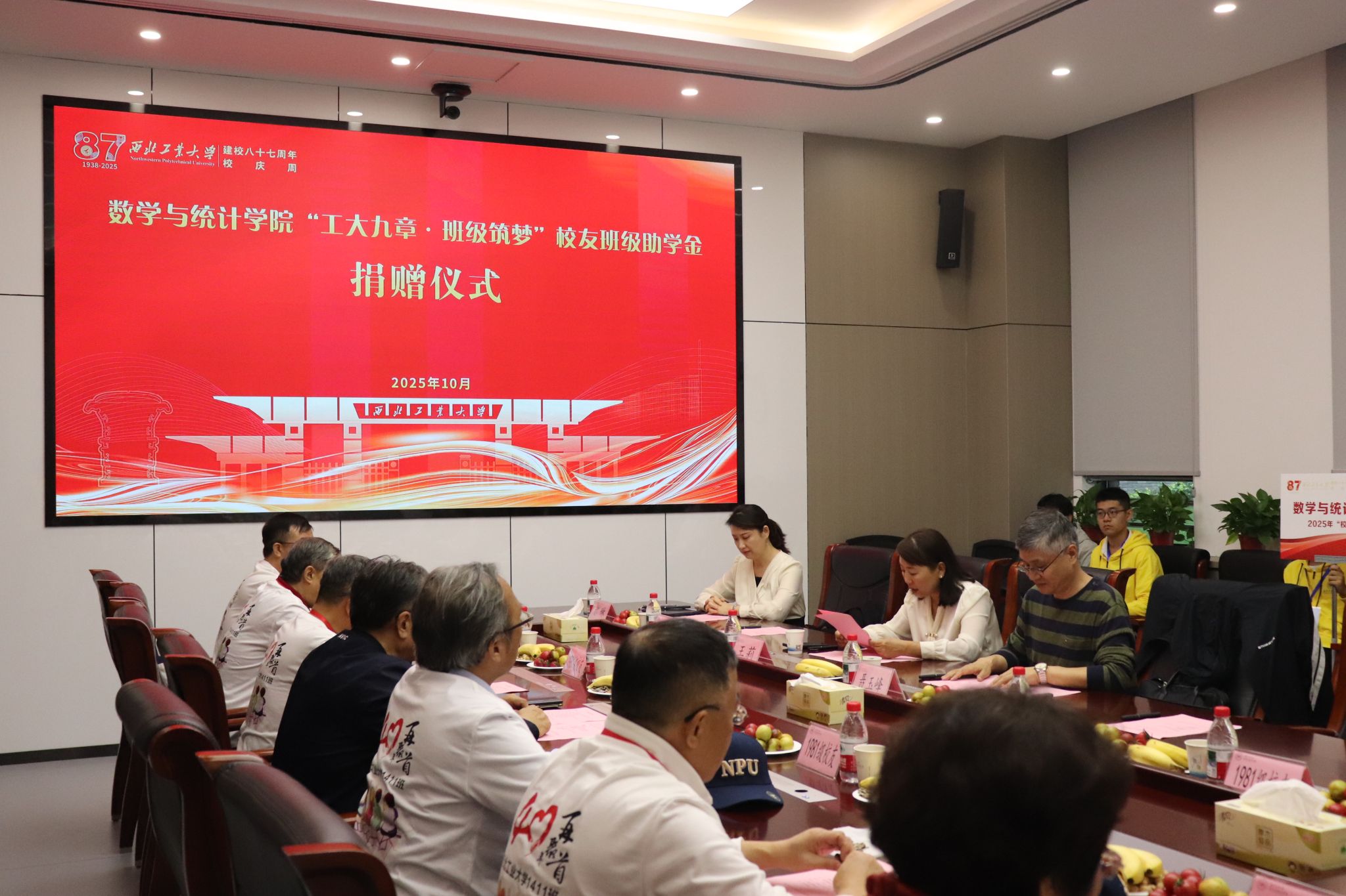 在重温毕业午餐后,1981级应用数学专业1411班在海天苑大楼香香腐宅 会议室组织的“工大九章·班级筑梦”校友班级助学金捐赠仪式,再次将本次系列活动推上高潮。仪式上,学院党委书记王莉、院长聂玉峰、对外联络办公室副主任苟兴旺先后代表学校、学院对校友们回家表示热烈欢迎,对校友们此次捐赠的善意善举表示感谢。校友王命宇代表班级签约,并表示希望西工大的这种传承精神能够不断延续下去、使更多的学弟学妹们在温暖的校园中茁壮成长。苟兴旺老师也动情地表示热烈欢迎各位校友常回家看看,母校永远是大家的坚强后盾。