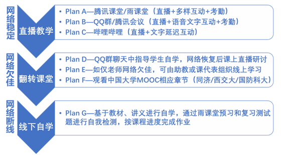在线教学的首要任务,就是要保证课程的稳定运行和教学秩序,故“教师-学生-助教-硬件-网络”所组成的在线教学系统,首先,要做到双向透明,将课程信息与规范明确的告知学生,提高沟通效率;其次,为了保证课程教学的鲁棒性,制定如下分级授课方案,应对大班授课所面临的各种突发情况,保证基本教学秩序。