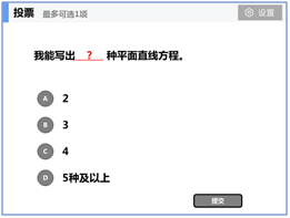 · 选择题的一专多能。课堂中的互动的重点不是“对错”而是“了解”,课堂互动不是“我不要你觉得,我要我觉得”,而应该是“我不要我觉得,我要你觉得”。所以,做选择题的目的也是为了了解学生对知识的掌握,同时,通过做这道选择题加深学生对知识的理解。下图中在有限时间内完成了那道题就选相应的选项,如果都不会就选D,最后要把所有人的答题情况发给学生,使得学生在“独自”学习中也能找到“参照物”,对自己的学习效果进行定位,及时调整学习方法和跟上课程节奏。