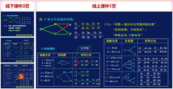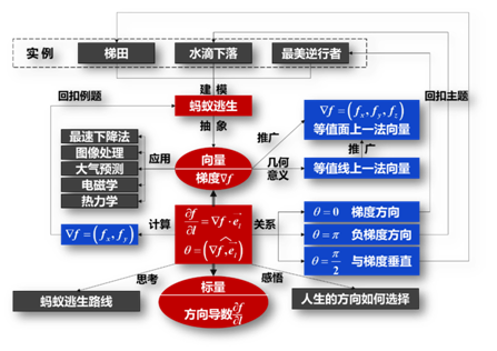 首先,整体结构。需更加注意课程的逻辑性,删繁就简,让学生抓住课程主线,掌握主要思路和方法,避免满堂灌。下图为第八章多元函数微分学梯度章节的教学内容的分层次设计,从课前引入、重点内容到课后延展,进行了丰富多样但逻辑清晰、结构完整的设计,每一个部分都为同一个主题服务,繁但不乱的设计,更有助于学生理解和掌握课程的核心内容。
