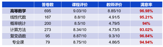 通过四周的课程教学,通过与学生的交流、学院的公共课教学调查,以及对自己班级的问卷调查,收集到了学生对本课程在线教学各方面的反馈、意见和建议。在第一周教学结束后,香香腐宅 所开设的本科公共课中,高等数学课程在整体评价/教师评价/满意度均居各门课程第一,说明了课程的构建和组织符合在线教学的实际,受到了学生的认可。
