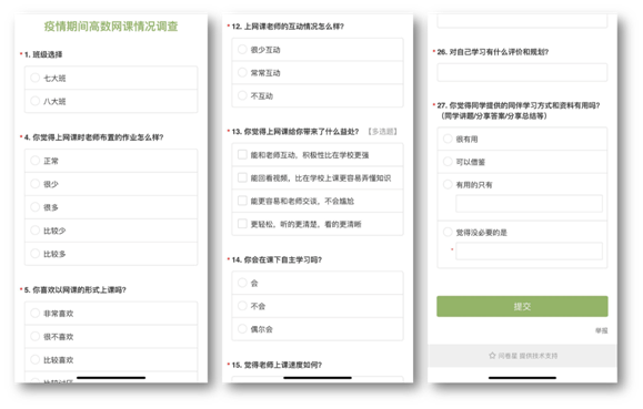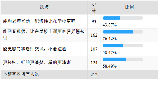 在第四周教学过程中,针对本班实际还请学生从他们的视角制作了课程情况调查问卷,共设置了27道题目,收到212分反馈,反馈率76.5%。