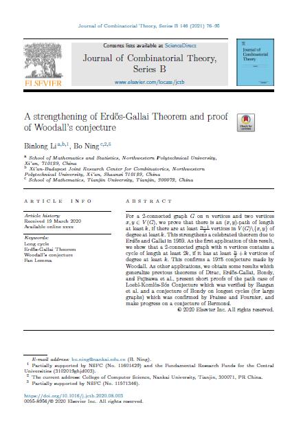 我校图论与组合数学团队一直把开展一流的研究工作,在高水平期刊上发表论文作为一个主要目标。近三年来团队在JCTB、Journal of Graph Theory、SIAM Journal on Discrete Mathematics、European Journal of Combinatorics、Electronic Journal of Combinatorics等图论方向著名期刊上发表论文多篇。此次李斌龙副教授与合作者攻克Woodall猜想,将进一步提升团队成员从事高水平研究和发表顶级论文的信心。