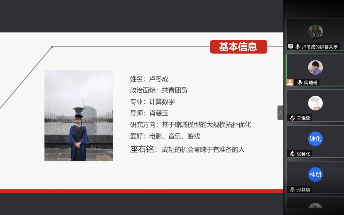 卢冬成围绕着学习科研和日常生活两个方面展开阐述。回想起自己一开始踏上科研之路,面对着陌生的科研内容和突然转变的学习节奏,一度陷入过彷徨与迷惘之中,一时难以把握奋斗的目标和方向。但是在导师的悉心指导和同学们的殷切鼓励下,以及在个人的不断尝试、努力、适应和改变下,积累起了研究经验,并渐渐地从对知识的单纯学习者蜕变为领域内的开拓创新者,最终得以冲破科研的迷雾。最后,卢冬成希望各位学弟学妹们不负韶华、脚踏实地、带着“会当凌绝顶,一览众山小”的豪气勇攀科研高峰,为学校和学院争光添彩!