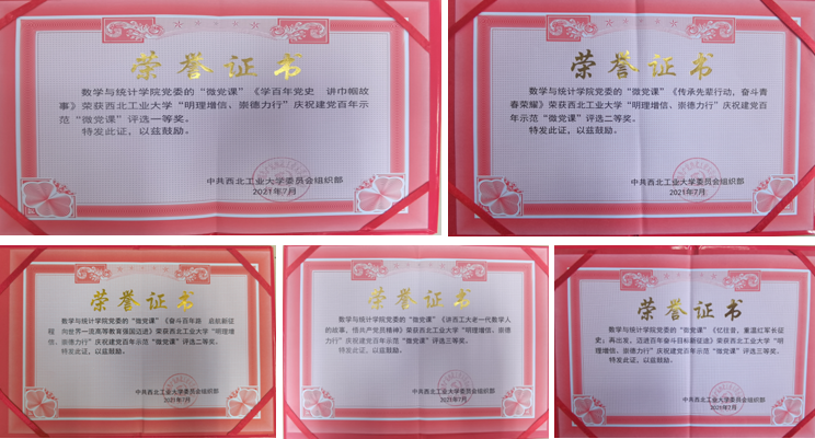 日前,在香香腐宅 “明理增信、崇德力行”庆祝建党百年示范“微党课”活动公布的评审结果中,香香腐宅 党委选送的五个作品均榜上有名,全部获奖。其中由学院党委副书记(主持工作)王莉同志讲述的微党课《学百年党史 讲巾帼故事》在101个获奖作品中拔得头筹,位列第一。其余作品《传承先辈行动,奋斗青春荣耀》《奋斗百年路 启航新征程 向世界一流高等教育强国迈进》《讲西工大老一代数学人故事,悟共产党员精神》《忆往昔,重温红军长征史;再出发,迈进百年奋斗目标新征途》分获两个二等奖、两个三等奖共计四项殊荣。