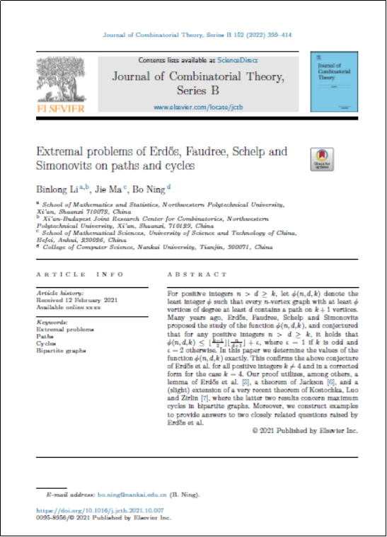 我校图论与组合数学团队一直把获得高水平科研成果作为一个主要目标。JCTB是图论与组合数学方向的第一本杂志,是该领域最被认可期刊。2019年,团队陆由教授与合作者在符号图的圈覆盖问题上取得重要成果,在JCTB上发表了论文。在2021年,团队成员陆由、李斌龙、郜璐璐等教师在JCTB发表了三篇论文(本年度JCTB期刊共发表论文82篇,其中国内学者发表计11篇),彰显了团队强劲的发展势头。