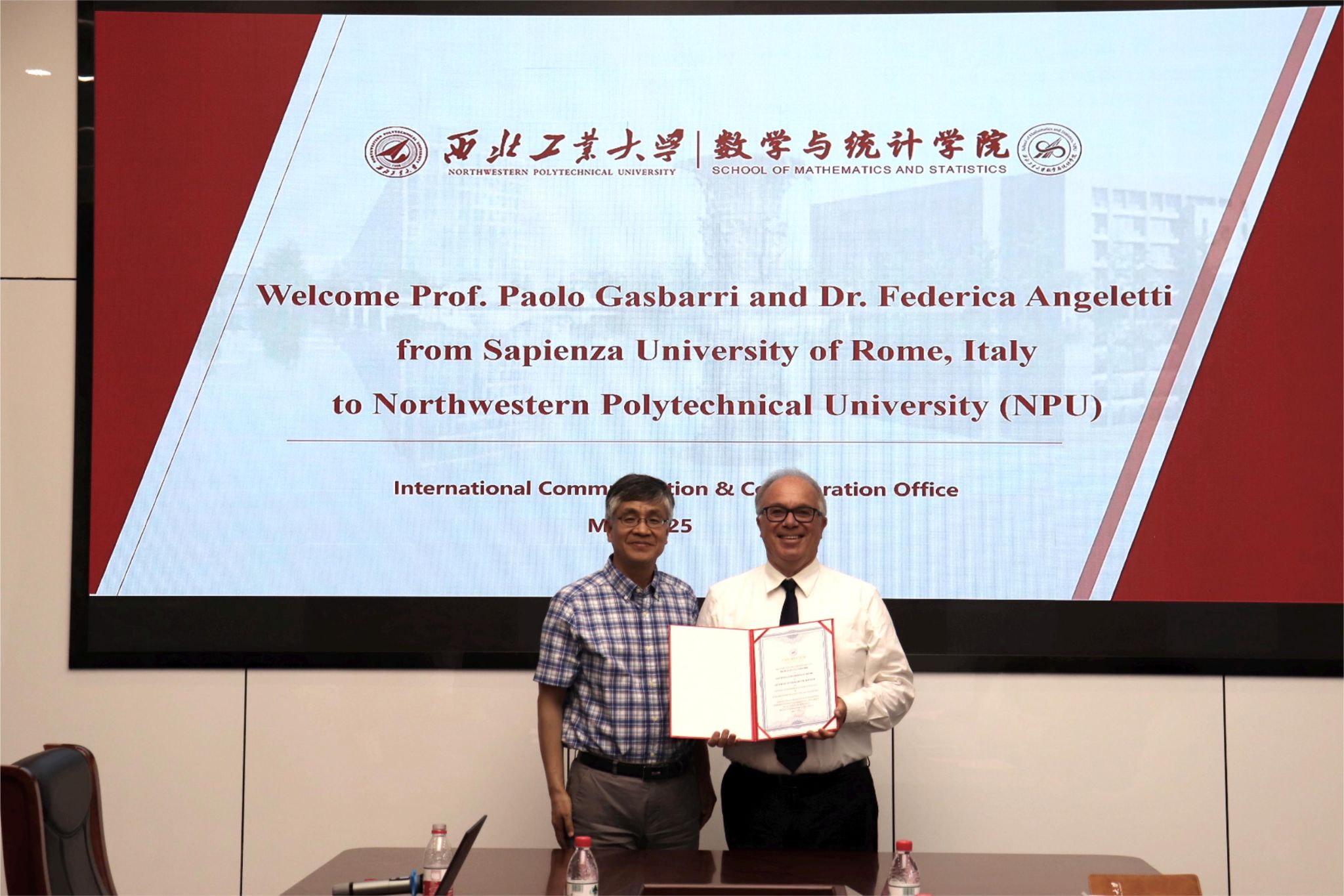 之后,肖曼玉教授介绍了我院相关情况。双方就本科生海外毕业设计、硕博联合培养暑期国际学堂等合作事项展开深入探讨。聂玉峰院长代表学院向 Paolo Gasbarri 教授颁发了“九章荣誉教授” 聘书,表达了对此次合作的高度重视。聂院长期待以此次合作为起点,推动两校在航天数学建模、复杂系统分析等领域的联合攻关,共同探索学术前沿,培养具有国际视野的高素质人才。
