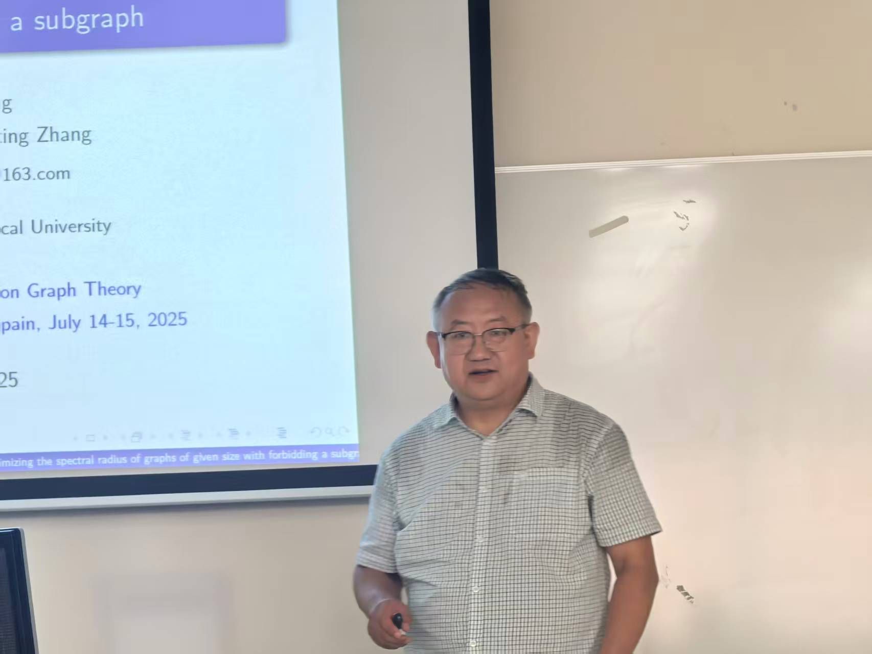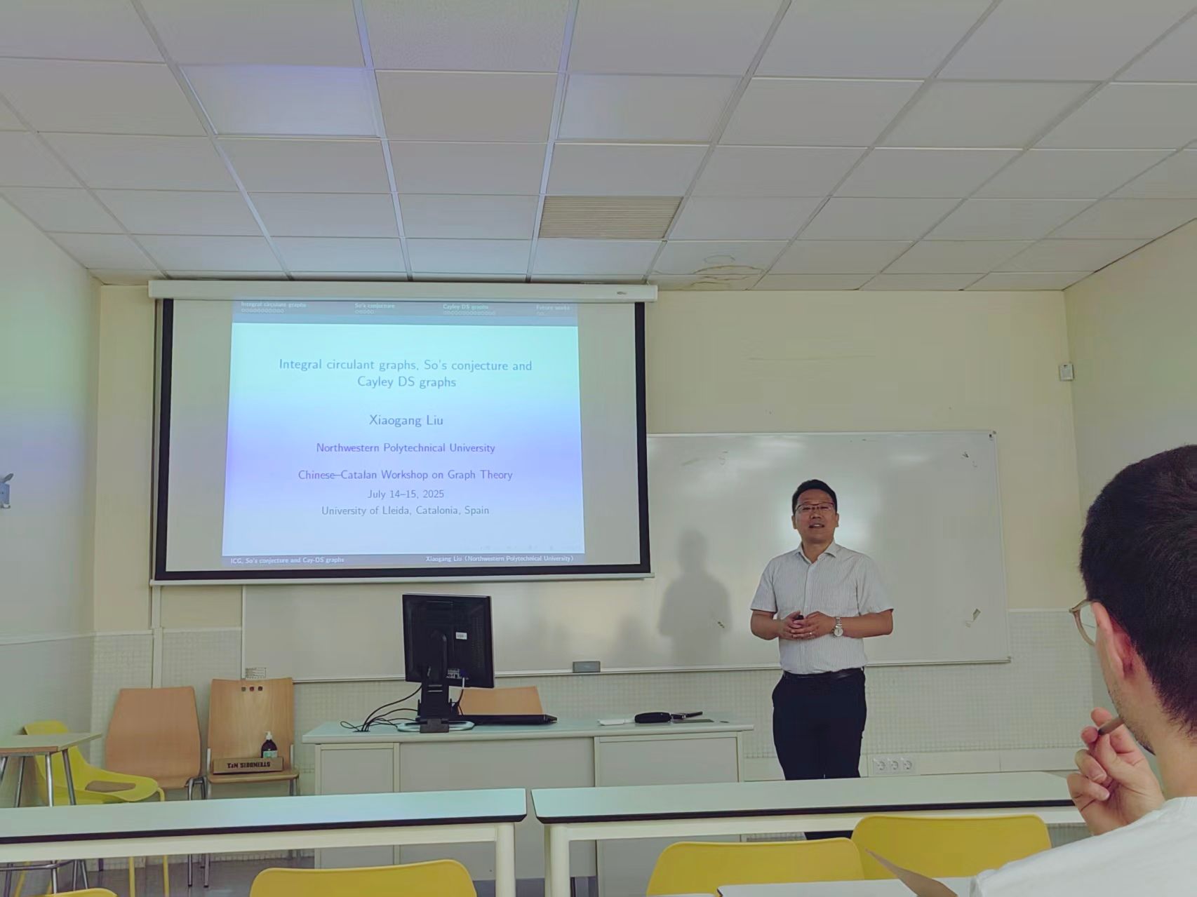 7 月 14 日至 15 日,由张胜贵教授与 Cristina Dalfó 教授共同发起的 “图论及其应用双边研讨会” 在莱里达大学数学系学术报告厅成功召开。研讨会紧扣学科前沿,安排 11 场高水平学术报告——其中中方6场,西方5场。与会专家围绕图中圈、匹配与流、谱图兰问题、Moore图和图谱应用等主题展开分享。现场讨论热烈,双方就多个关键问题交换思路,为未来合作研究明确了突破口。