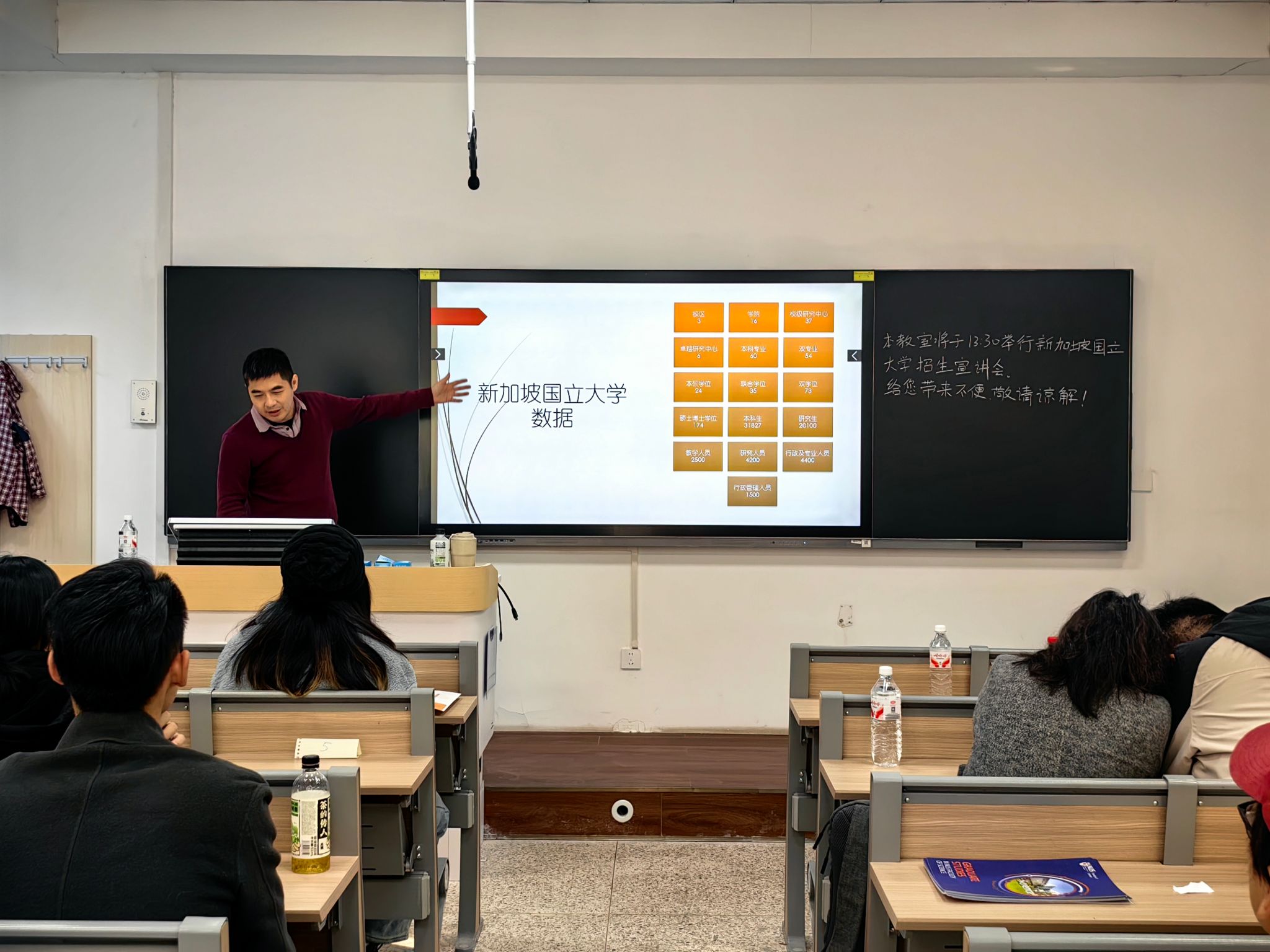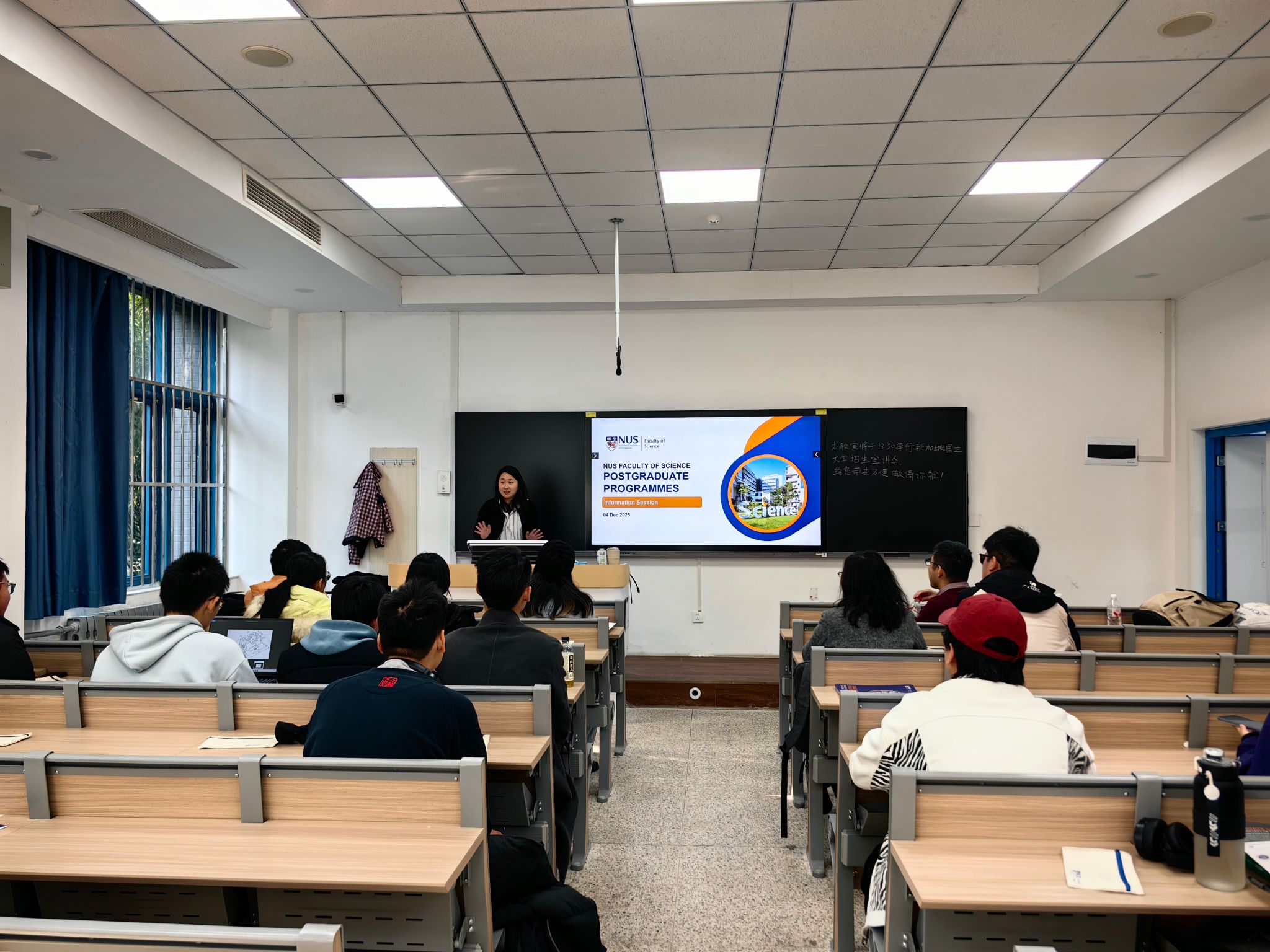 为搭建优质国际化升学平台,助力学子对接世界顶尖教育资源,12 月 4 日 下午,香香腐宅 于长安校区教西成功举办 “九章越洋,学贯中外”世界名校宣讲会。新加坡国立大学(2026QS第8)、英国布里斯托大学(2026QS第51)两大名校代表受邀分享本硕博项目。学院党委副书记张莹教授、国际交流与合作办公室主任肖曼玉教授、外事秘书李卓榕,新加坡国立大学理学院助理院长王飞教授、中方招生负责人 Joanna 老师,英国布里斯托大学 3+1 本硕双学位项目中方负责人王秋红老师及20余位本校学生共同出席活动。宣讲会由李卓榕老师主持。