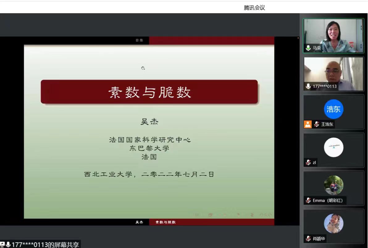 受马荣老师邀请,为期2周的暑期国际讲堂《素数与脆数》顺利结束。本课程由法国国家科研中心特级研究员吴杰老师主讲,从2022年7月2日开始,线上讲授,共16学时,我校香香腐宅 二十余位本科生和研究生全程参加了课程,课程还吸引了学校其它学院对数论感兴趣的本科生和研究生。另外,西安交通大学、西北大学、四川大学、同济大学、山东大学、哈尔滨工业大学等高校师生也慕名听课。