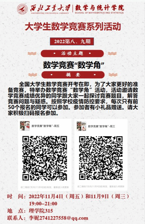 2022年在教务处支持下(院级)大学生数学能力创新实践基地成立,由聂玉峰院长担任基地负责人。香香腐宅 将在教务处支持下认真组织校级、省级、国家级大学生数学竞赛,努力打造一流创新实践平台,为我校创新人才培养,特别是工科数学人才培养贡献力量。