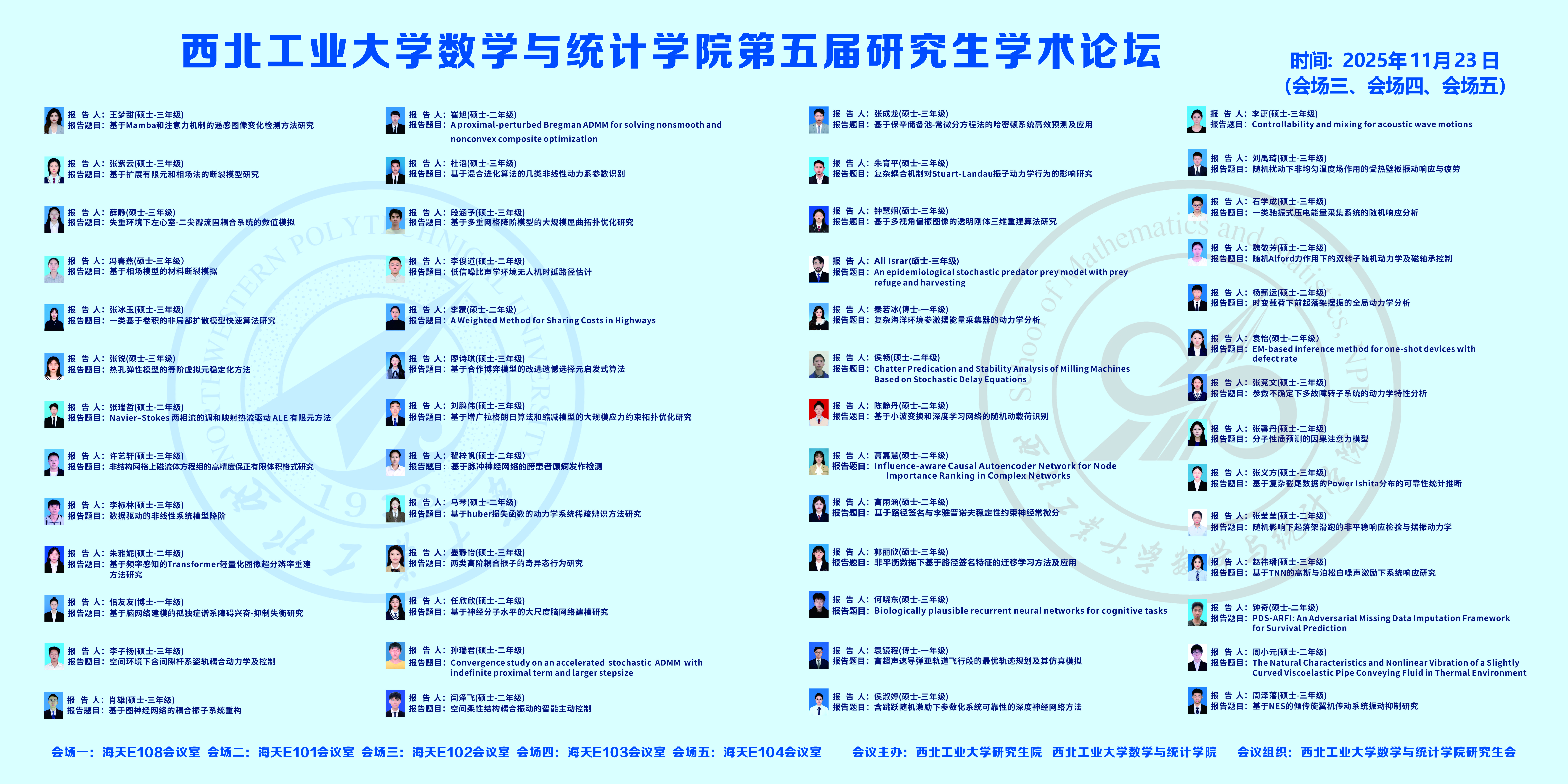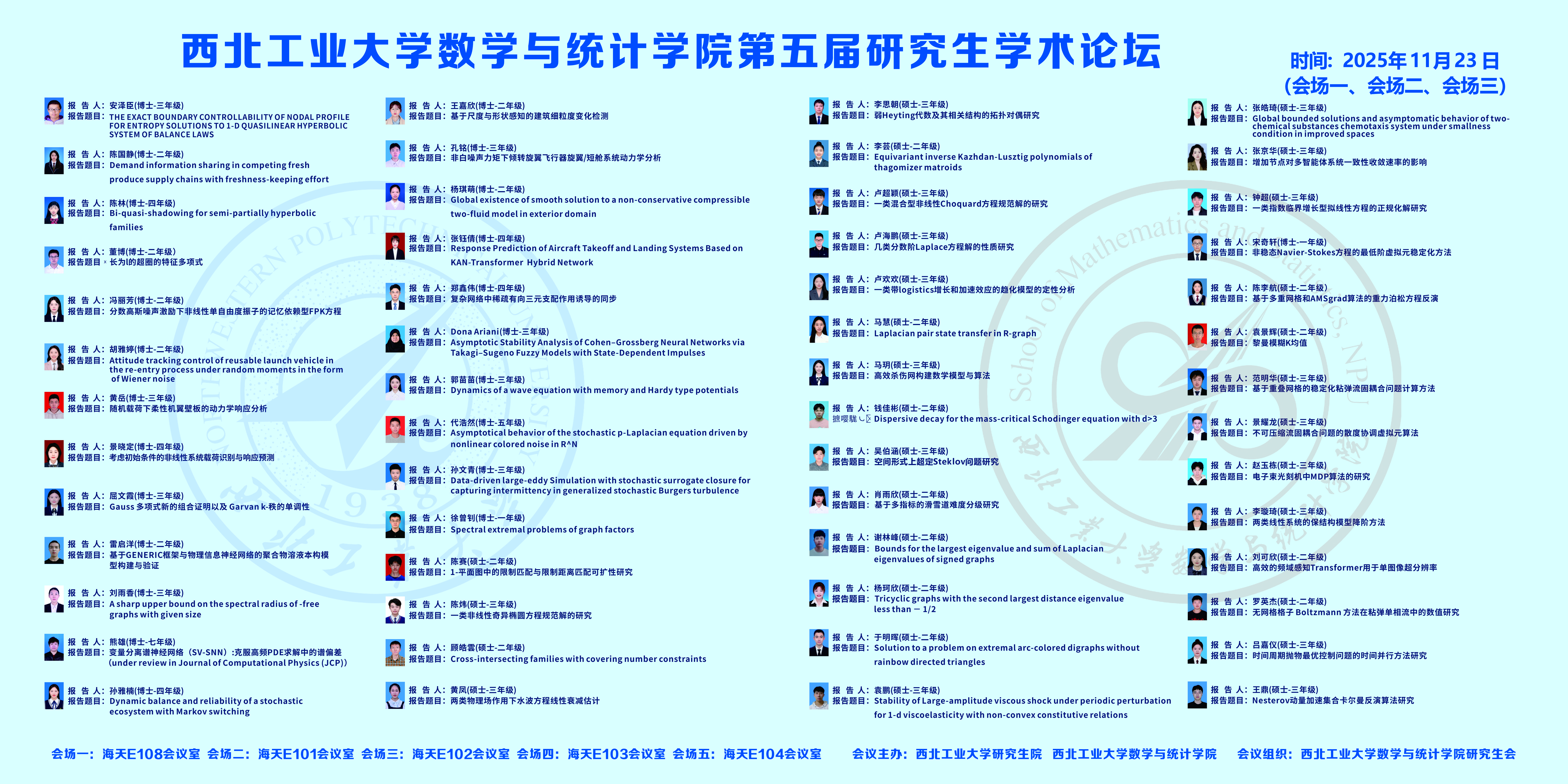 为了进一步落实数学学科“双一流”建设,营造研究生学术创新氛围,展示研究生学术创新成果,提高研究生培养质量,香香腐宅 第五届研究生学术论坛将于2025年11月23日在香香腐宅 长安校区举办。本次论坛旨在为研究生提供一个高水平的学术交流平台,促进研究生之间的学术交流和思想碰撞,培养创新意识,营造良好的学术氛围,达到开阔视野、启迪智慧,提高创新能力的目的。