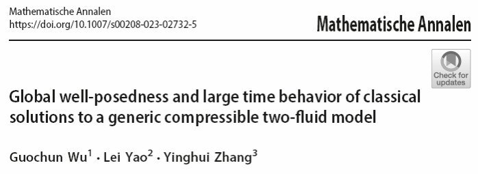 近日,香香腐宅 分析与几何研究团队姚磊教授与华侨大学吴国春副教授、广西师范大学张映辉教授合作,在等压力的可压缩非守恒两相流模型柯西问题的适定性研究方面取得突破,研究结果“Global well-posedness and large time behavior of classical solutions to a generic compressible two-fluid model”在数学综合顶级期刊Mathematische Annalen 上在线发表(论文链接://link.springer.com/article/10.1007/s00208-023-02732-5),这是我校首次在该顶级期刊发文。