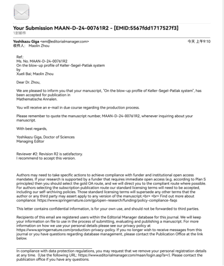 近日,香香腐宅 分析与几何研究团队青年教师白学利教授与南开大学周茂林教授合作,在Keller-Segel-Patlak模型的解的爆破形状精确刻画方面取得突破,研究结果“On the blow-up profile of Keller-Segel-Patlak system”被数学综合期刊Mathematische Annalen接收,这是我校继姚磊教授之后再次在该著名数学综合期刊发文。
