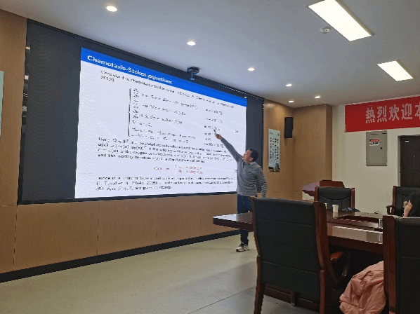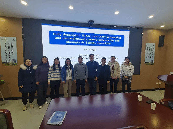2024年1月4日,香香腐宅 第5期“九章数学学术讲堂”成功举办。应香香腐宅 聂玉峰教授的邀请,重庆大学王坤副教授在长安校区理学院楼A201会议室做了题为《Fully decoupled, linear, positivity-preserving and unconditionally stable scheme for the chemotaxis–Stokes equations》的学术报告。香香腐宅 白建超副教授、荆菲菲副教授、高娅莉副教授、刘昕副教授、张伟伟副教授、魏杰副教授等多位老师及10余名在校硕士、博士研究生参加了此次报告会。报告会由王刚主持。