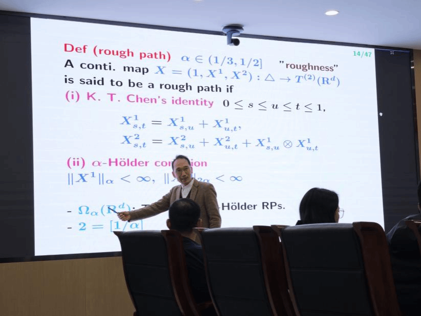 Yuzuru Inahama的报告聚焦于粗糙路径理论,对这一学科进行了深入而全面的阐述。与传统的伊藤随机微积分理论不同,粗糙路径理论摆脱了随机过程增量独立性和马氏性的理论限制,它不依赖于概率框架,而是从路径的角度为理解由“粗糙”的轨道驱动的非线性随机系统提供了强大的理论基础。Inahama在演讲中深入探讨了多个方面,包括受控常微分方程、几何粗糙路径、粗糙微分方程以及受控路径的Gubinelli理论等。本次讲堂的举办活跃了我院师生在粗糙路径理论方面的学术交流,更拓宽了师生的研究视野。