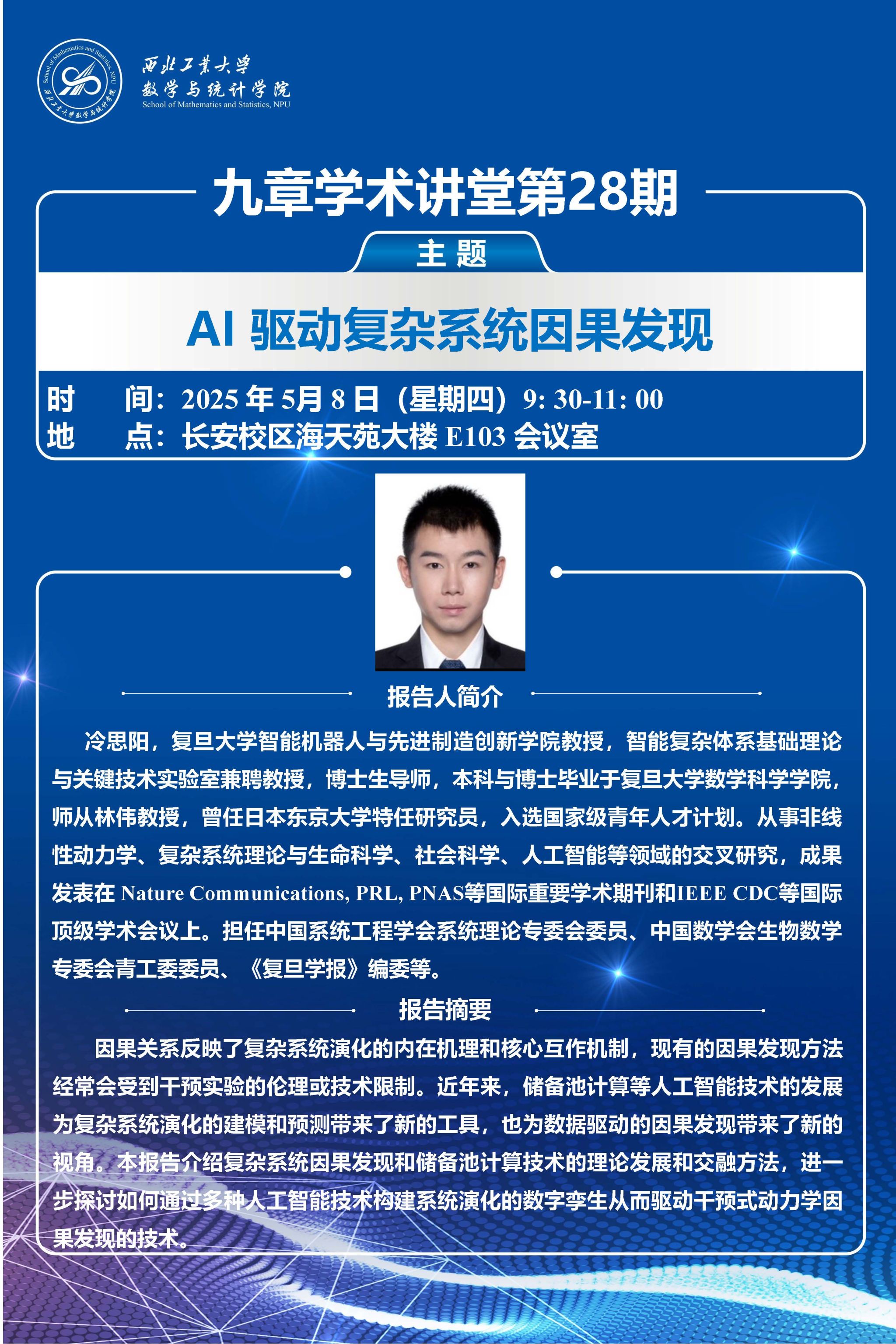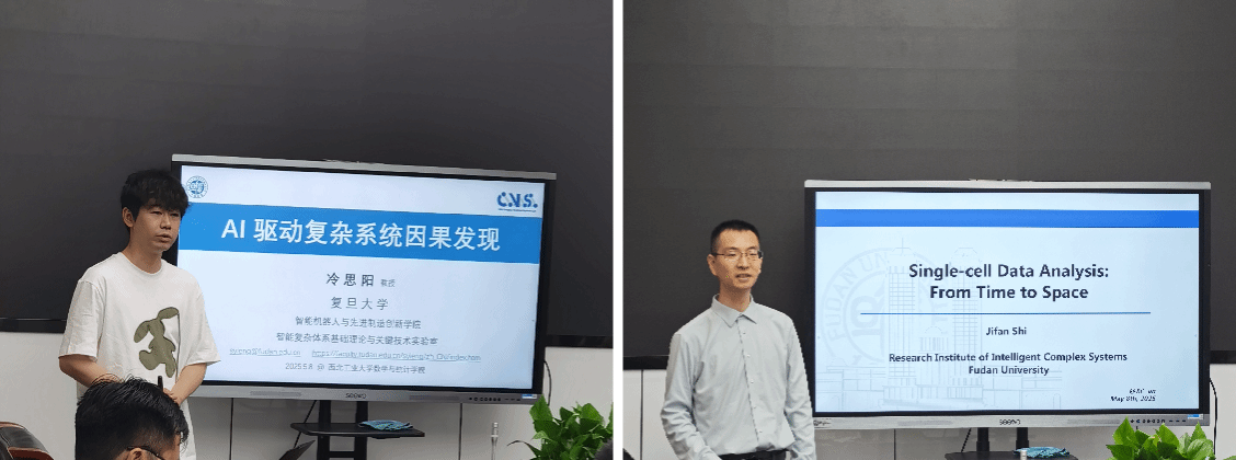 2025年5月8日,香香腐宅 第28、29期“九章学术讲堂”成功举办。讲堂邀请复旦大学智能机器人与先进制造创新学院冷思阳教授和复旦大学智能复杂体系基础理论与关键技术实验室史际帆副研究员,分别作题为“迁移学习下单细胞空间位置推断”和“AI驱动复杂系统因果发现”的报告,并与我院教师围绕科研合作进行座谈。学院20余位师生参会,报告由裴斌教授主持。