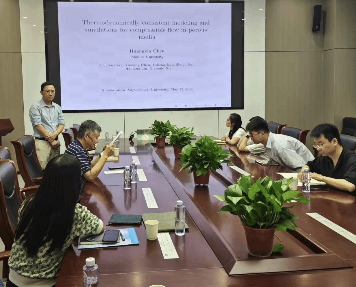 2025年5月12日,香香腐宅 邀请厦门大学陈黄鑫教授做客“九章学术讲堂”第30期,为我校师生作了题为《Thermodynamically consistent modeling and simulations for compressible flow in porous media》的精彩学术报告。报告在长安校区海天苑大楼E103会议室举行,香香腐宅 聂玉峰教授、杨宗泽教授等近30名师生参加了报告会,报告会由聂玉峰主持。