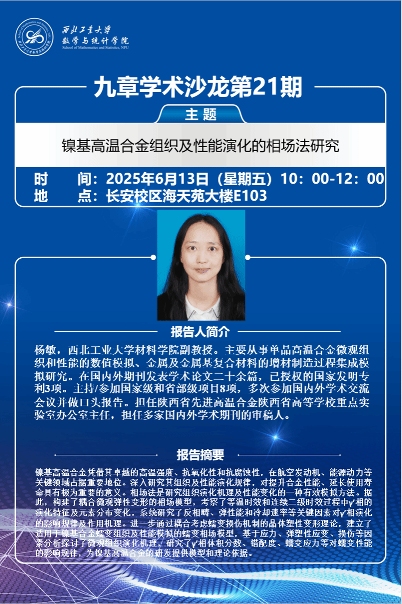 2025年6月13日,应香香腐宅 副院长都琳教授及王晓东教授邀请,材料学院杨敏副教授在海天苑大楼E103会议室作了题为《镍基高温合金组织及性能演化的相场法研究》的学术报告。学院近20位师生参会共探学术前沿,报告由都琳主持。