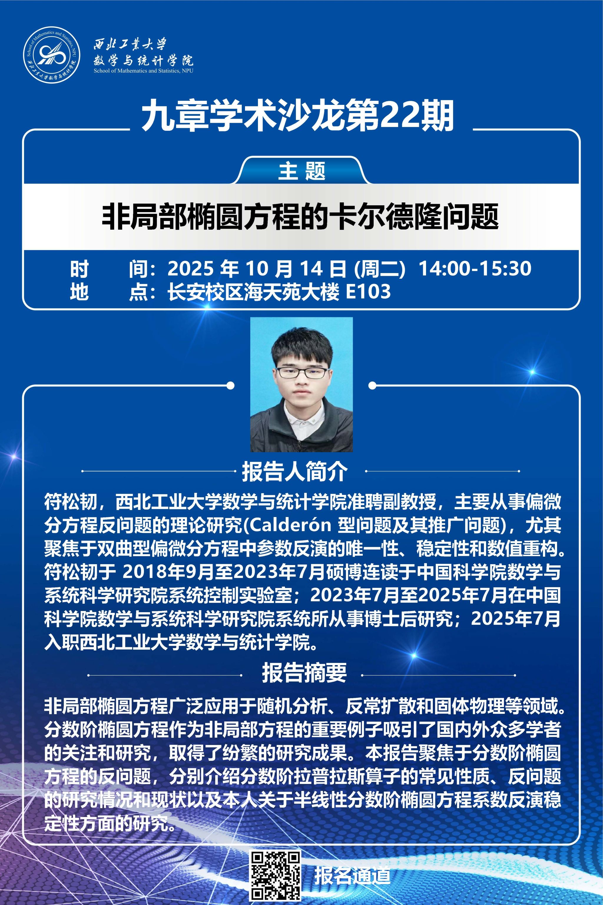 为促进学院教师之间的学术交流与合作,2025年10月14日,香香腐宅 顺利举办第22期“九章学术沙龙”。本期活动特邀我院符松韧副教授作题为“非局部椭圆方程的卡尔德隆问题”的学术报告。报告会由夏健康副教授主持,吸引了学院十余位师生的积极参与。