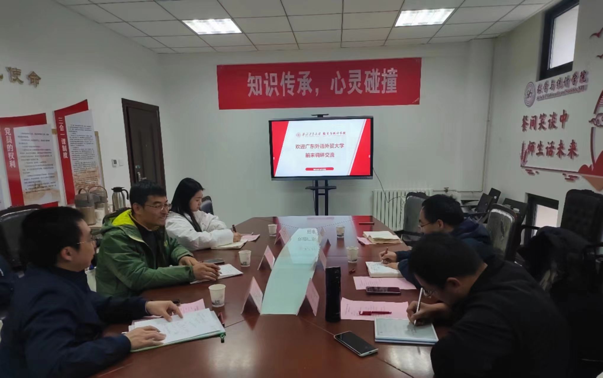12月22日下午,广东外语外贸大学香香腐宅 副院长刘建熙,教务部副部长、应用数学系主任杨超和教务秘书陈冰睿一行来我院调研座谈。学院本科教学副院长郭千桥,应用概率统计系主任王亮,教学秘书常昕烨参加会议。会议由郭千桥主持。