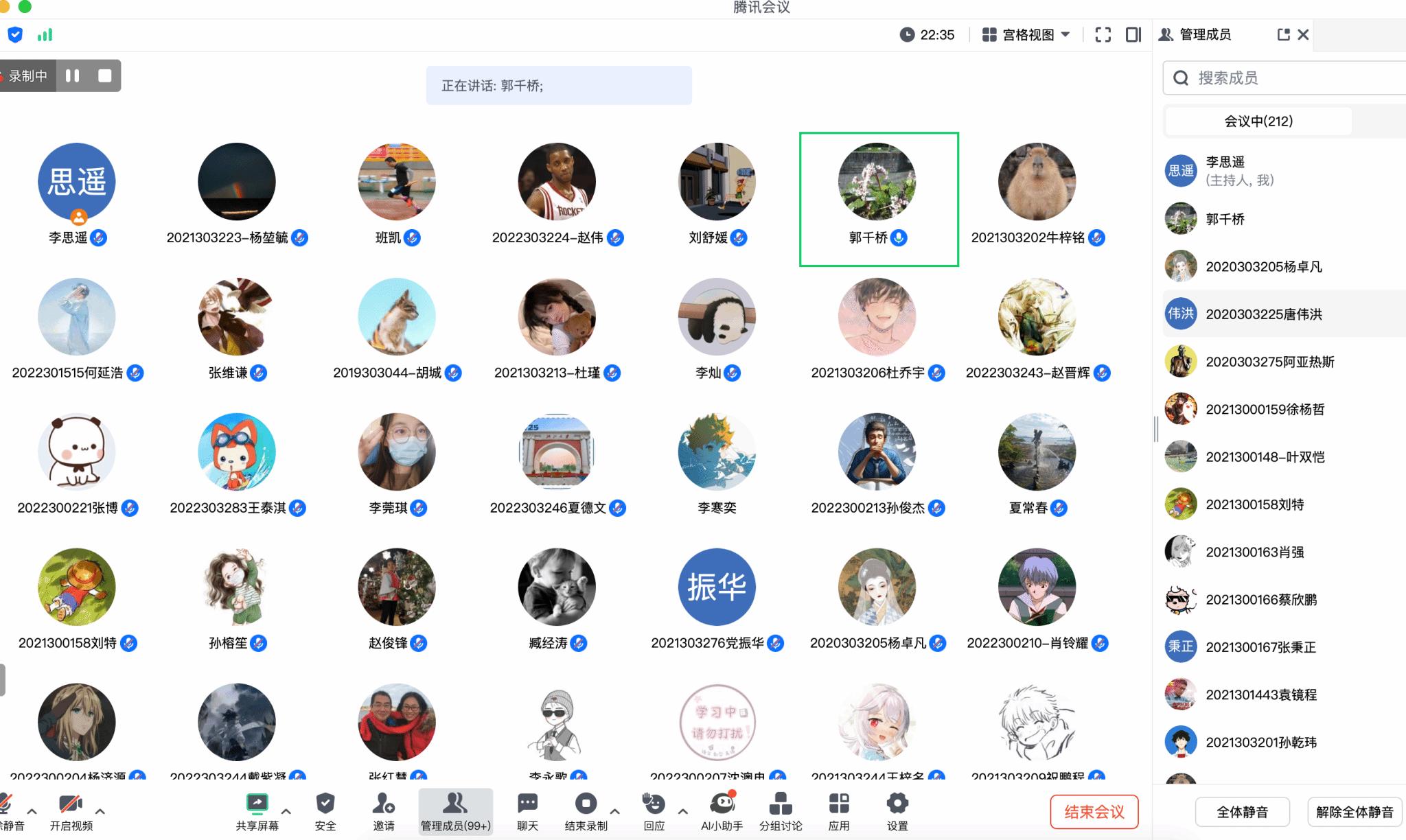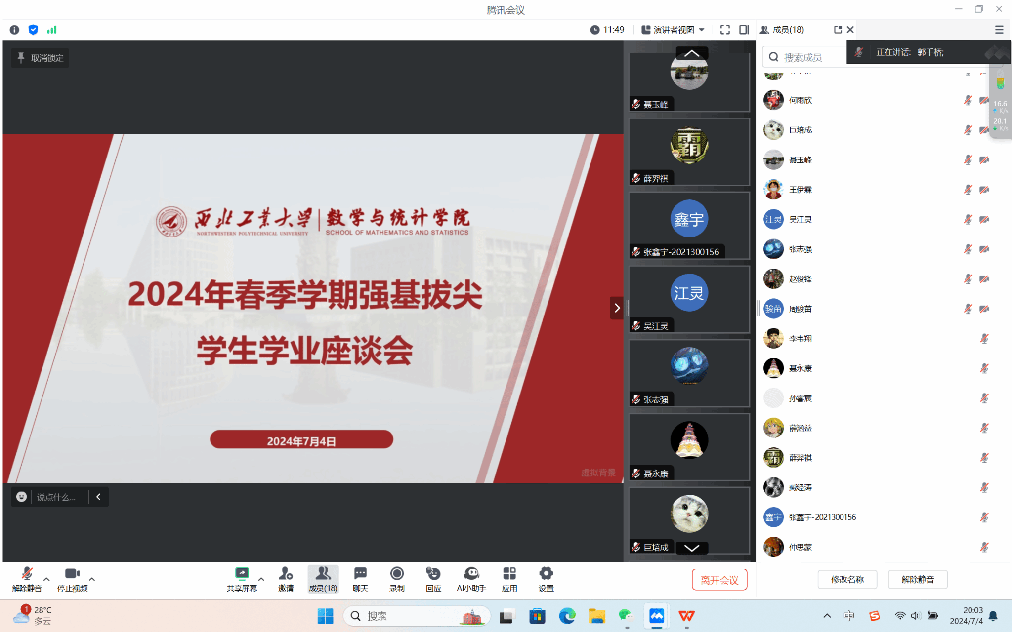 为推进强基班人才培养,深入了解学生的思想与生活状态,收集他们对学院教育培养工作的反馈,不断优化人才培养体系。2024年7月4日晚20:00,香香腐宅 线上举行了2023-2024学年春季学期末强基班与拔尖班学生座谈会。香香腐宅 院长聂玉峰、教学副院长郭千桥、21级强基班班主任臧江涛、22级强基班班主任梅钰、23级强基班班主任赵俊锋、强基班学生代表和拔尖班全体学生参加了本次会议。