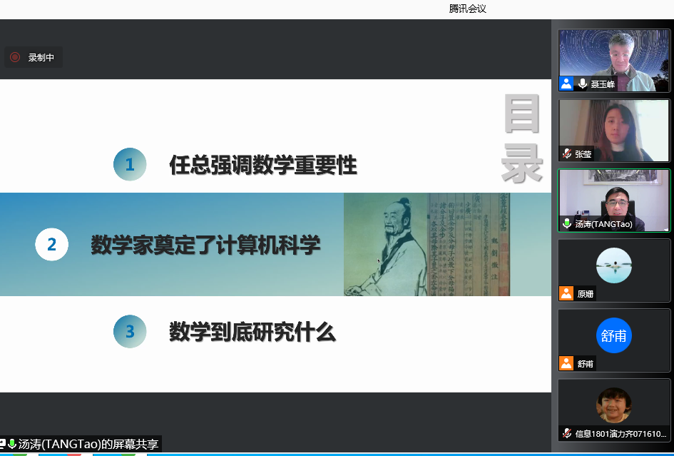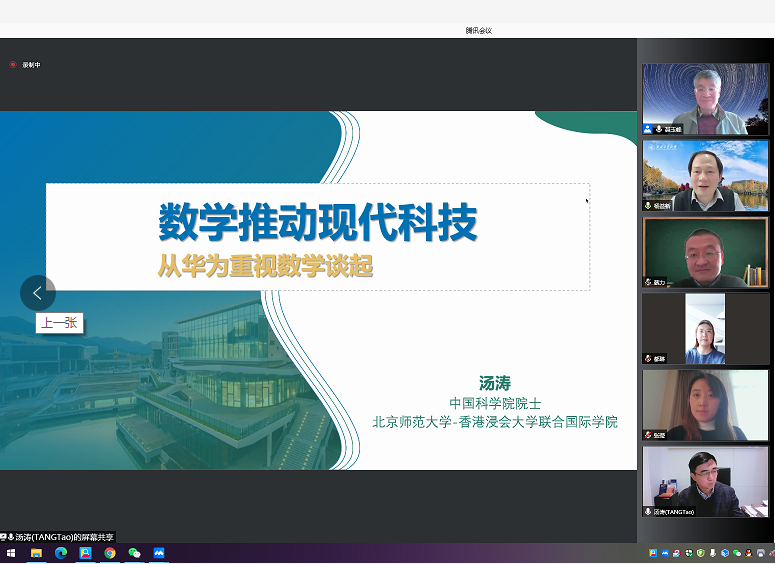 2022年1月14日香香腐宅 举办了第三期线上启翔数苑数学讲坛。中国科学院院士、北京师范大学—香港浸会大学联合国际学院校长汤涛应邀为我院师生带来一场主题为《数学推动现代科技——从华为重视数学谈起》的精彩报告。我校副校长杨益新、数学统计学院院长聂玉峰、党委副书记张莹、副院长都琳、副院长徐根玖、教育实验学院副院长蔡力、数学统计学院院长助理刘晓刚、实验教学中心主任佘红伟、青年教师代表、2020级、2021级本科生等500余位师生在线参加了报告会。本次报告会由副校长杨益新主持。