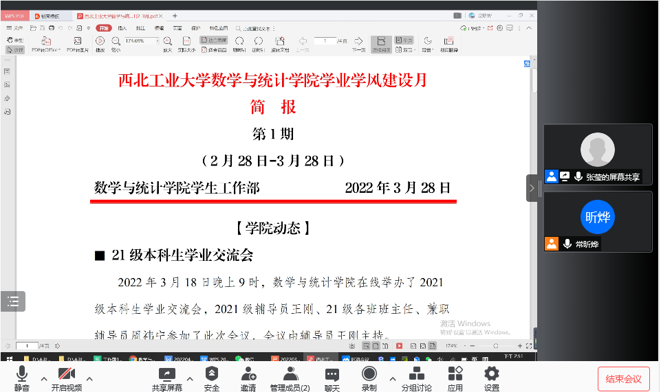张莹汇报了学生工作展开情况,介绍了学院的学业学风建设月活动,对18级的考研情况,各年级学生学业成绩、目前存在的问题和原因进行了分析,并介绍了下一步措施。