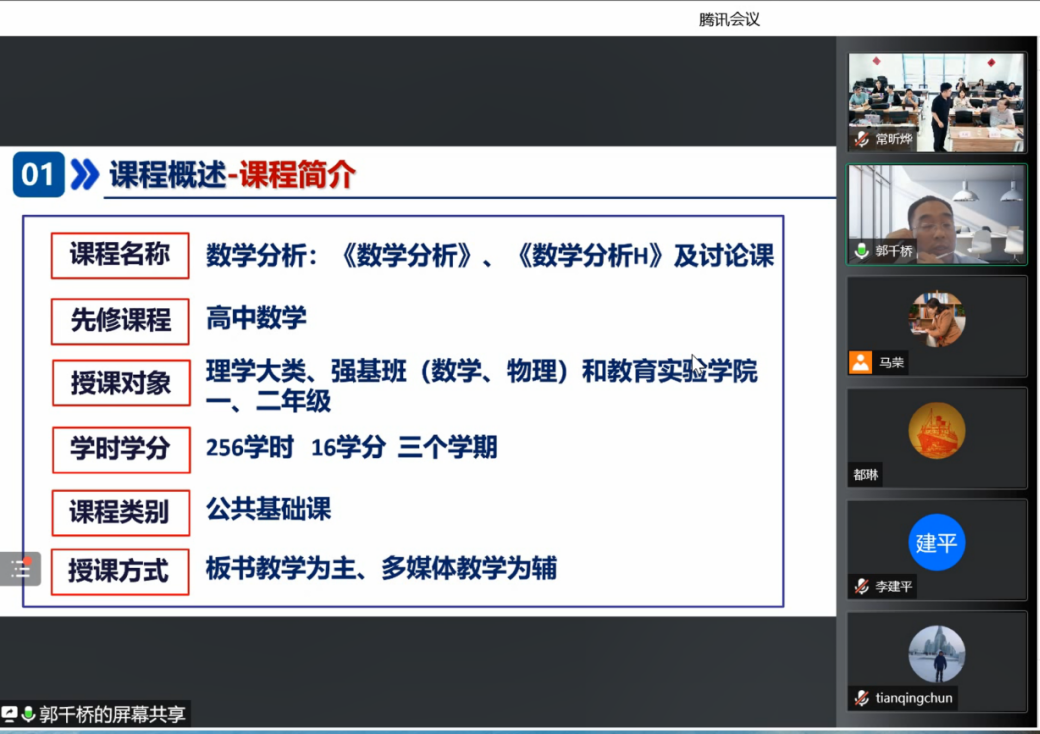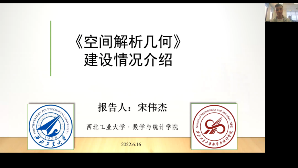 第二环节为研讨报告,由西工大香香腐宅 教发中心副主任马荣副教授主持。邀请郭千桥教授、刘哲教授和宋伟杰副教授分别介绍我校数学分析、高等代数和空间解析几何课程的建设情况,三位报告人主要围绕课程建设情况与遇到的问题,和专家展开深入交流,探讨课程的进一步建设方向与规划。