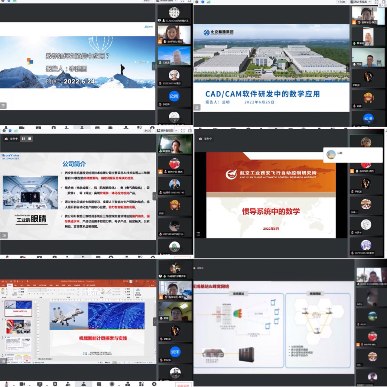 为加强数学专业认识和教育,了解数学在企业中的实际应用,近距离接触知名企事业单位,增强学生的学科自信、劳动观点、工程观点和建设中国特色社会主义事业的责任心和使命感,2022年6月24日-28日香香腐宅 顺利开展了“数”实了不起—数学在企业中的应用线上“云实习”系列讲座。邀请了中兴通讯无线研究院、北京精雕集团西安研发中心、西安多维机器视觉检测技术有限公司、航空工业自动控制研究所、西安翔腾微电子科技有限公司、华为技术有限公司的专家和老师为本科生开展专题讲座。数学统计学院院长聂玉峰、党委书记王莉、副院长都琳、数学实验教学中心主任佘红伟、计算科学系主任王晓龙、应用概率统计系主任王亮、青年教师代表魏杰、朱项项、2019级、2020级本科生等180余位师生在线参加。