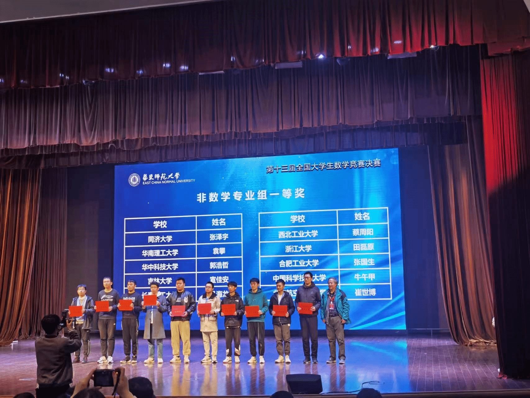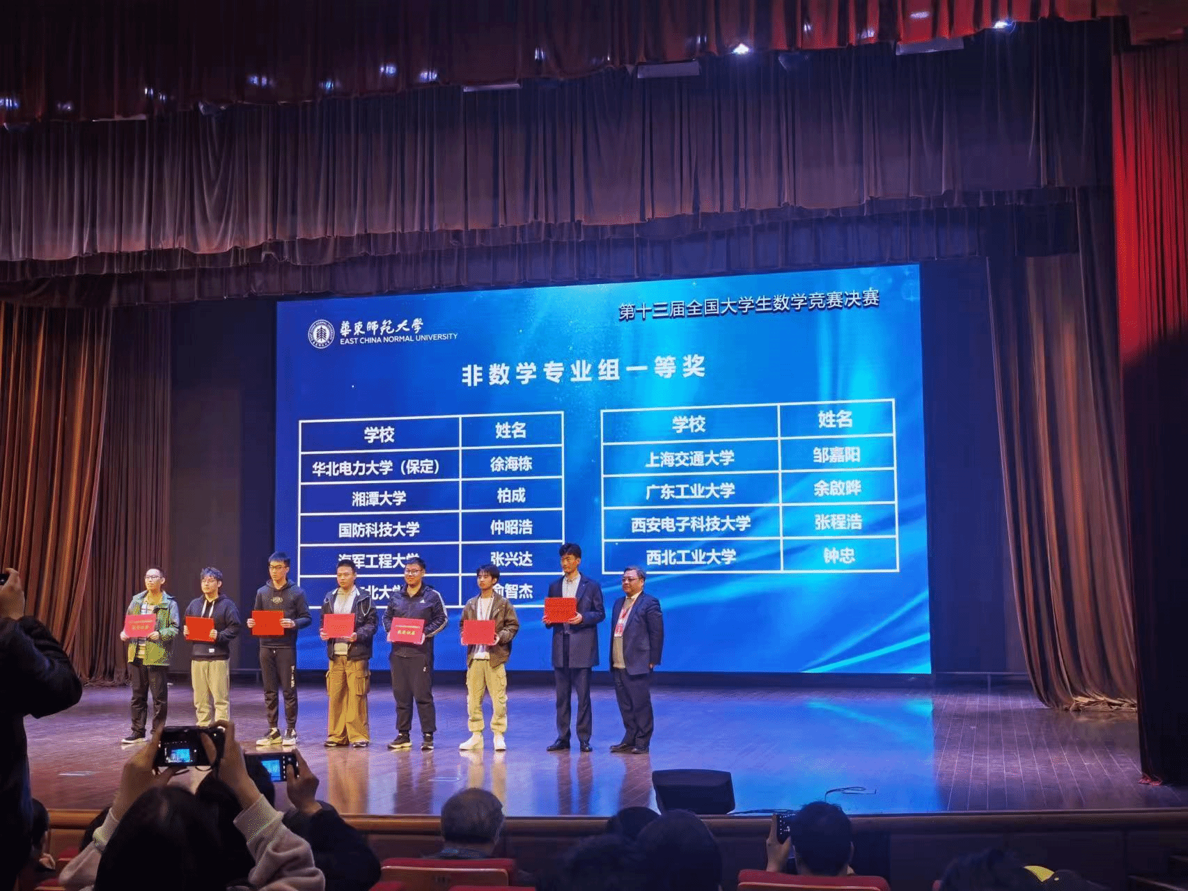 2023年3月25日早上,第十三届全国大学生数学竞赛决赛在华东师范大学举行。748名来自北京大学,清华大学,中国科技大学,西安交通大学等全国高校的学生同场竞技,展示其强大的数学实力。我校6名学生参赛,最终取得优异成绩,共获得全国一等奖2项、全国二等奖2项、全国三等奖2项。