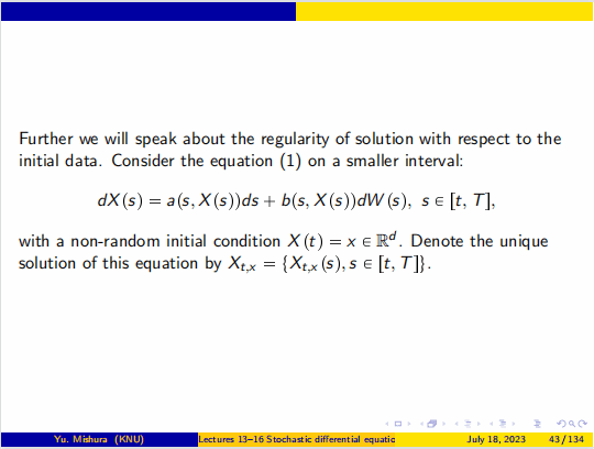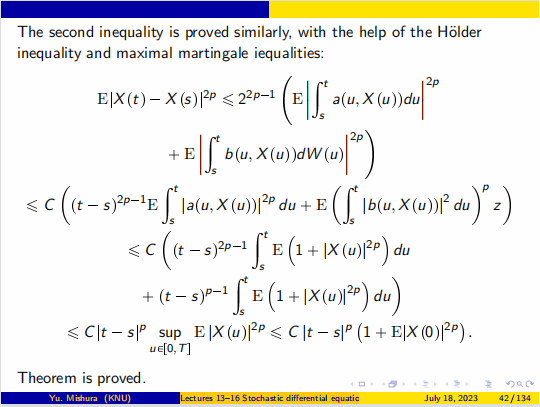 Yuliya Mishura教授首先回顾和重新定义《概率论》中的一些基本概念。包括概率空间、随机过程的定义和基本性质及其数学特征,条件期望的严格定义,以及鞅的概念与基本性质。Yuliya Mishura教授接下来介绍了此次本课程的一个重要概念布朗运动,以及布朗运动的性质、联合分布、首次命中时间和最大值的分布等内容,并由此引出随机积分和伊藤公式,通过应用伊藤公式求解随机微分方程,推导随机微分方程解的存在唯一性定理,及其强弱解的一致有界性等性质。