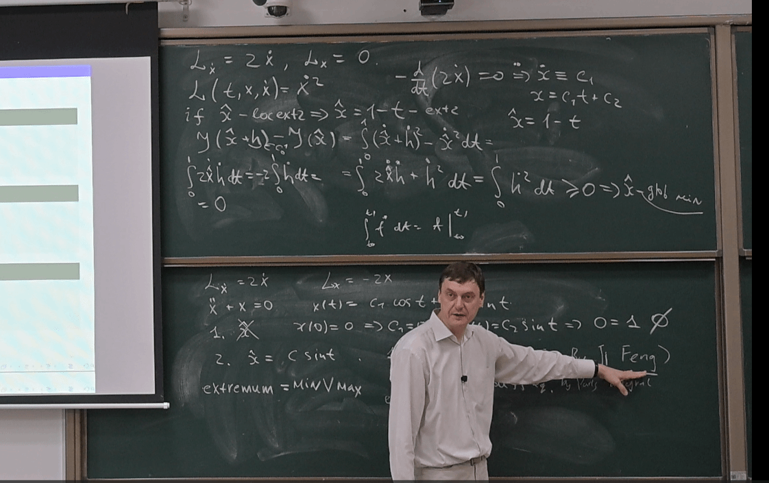 由于本课程体量大,涉及多门高等数学学科内容,同时需要兼顾实践技巧,给学生的学习带来了极大的挑战,为了克服这类难题,Alexey Gorshkov副教授采用 “追本溯源、化繁为简” 的教学方法:授课中注重与学生实时互动,根据反馈动态调整内容深度,对抽象数学概念通过初等化、特殊化处理,结合单摆、谐振子等典型案例解析核心方法。课程后期,以变分原理强弱二阶条件证明为例,从严格理论推导到简单模型求解,引导学生体会 “理论证明 — 实践应用” 的逻辑关联,强化知识迁移能力。